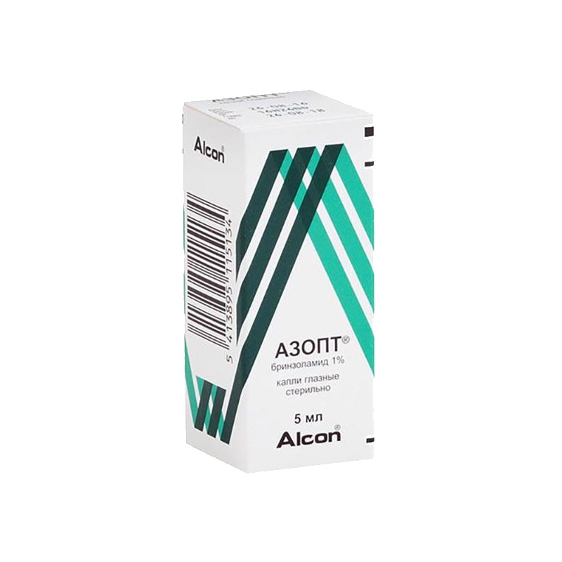 Суспензия белого цвета | Состав+1мл содержит :бринзоламид 10мг | Противопоказания+- повышенная чувствительность к любому компоненту препарата- известная гиперчувствительность к сульфаниламидам- серьезные нарушения функции почек- гиперхлоремический ацидоз. | Побочные действия+затуманивание зрения, преходящий дискомфортощущение инородного тела в глазураздражение глаза, гиперемия,блефарит, коньюктивиткератит, кератопатияслезоточивость, зудсухость глазснижение остроты зрениянеобычный привкус во рту (кислый или горький) после закапывания.При всасывании в редких случаях могут отмечатьсяпарестезии, характеризующиеся как временное онемение или ощущение покалывания в конечностях, депрессия и головокружение, головная больболь в груди, аллопеция, сухость во рту, тошнота и диспепсия. | Способ применения+Встряхнуть флакон перед употреблением!При применении в качестве монотерапии или в сопутствующей терапии Азопт закапывают по 1 капле два раза в день в нижний конъюнктивальный мешок пораженного глаза (глаз). Некоторым пациентам рекомендуют закапывать препарат 3 раза в день.Не следует прикасаться кончиком пипетки к глазам или любой другой поверхности, чтобы избежать загрязнения содержимого флакона.После закапывания рекомендуется прижатие носослезного канала или прикрытие век. Это снижает системное всасывание и неблагоприятное воздействие лекарственного препарата, применяющегося местно, через ткани глаза.При замене другого препарата против глаукомы глазными каплями Азопт, необходимо прекратить приём заменяемого препарата и начать прием Азопта на следующий день.При использовании нескольких офтальмологических препаратов местного применения, необходимо соблюдать интервал между закапываниями как минимум в 5 минут. | Показания к применению+- открытоугольная глаукома- повышенное внутриглазное давление- предоперационная подготовка.Азопт применяется для лечения повышенного внутриглазного давления в качестве монотерапии у пациентов, не реагирующих на бета-блокаторы, больных которым противопоказаны бета-блокаторы или в сопутствующей терапии с бета-блокаторами. | МНН: БринзоламидОбъем: