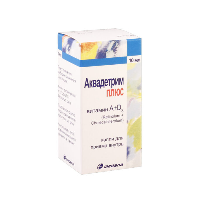 Аквадетрим плюс капли для приема внутрь, 10 млКомбинация витаминов А и ДДля профилактики и лечения гиповитаминоза и авитаминоза витаминов А и ДДля взрослых и детей старше 4 недель, беременных и кормящих грудью женщинОтпускается без рецепта | Состав+1 мл раствора (ок. 34 капель) содержитретинола пальмитат (витамин А) 20 000 МЕхолекальциферол (витамин D3) 10 000 МЕ | Противопоказания+- повышенная чувствительность к компонентам препарата- гипервитаминоз А и/или D- почечная недостаточность- состояния ослабленного всасывания (синдром мальабсорции) | Побочные действия+Не отмечается при применении в рекомендуемых дозах.Редко ‹ 1/10 000- аллергические реакции (кожная сыпь, зуд)- повышение концентрации кальция в крови и/или в моче- кальцификация тканей, мочекаменная болезнь- выпадение волос- нарушений функции печени | Способ применения+Препарат принимать внутрь с небольшим количеством воды.Примечание: 1 капля содержит около 580 МЕ витамина А и 290 МЕ витамина D3.Дозы препарата подбирает доктор индивидуально.Профилактически :- детям от 4-х недель до года жизни — по 2 капли в сутки;- детям от 1 года жизни до 18 лет — по 3 капли в сутки;- взрослым — по 3 капли 2 раза в сутки. | Показания к применению+Профилактика- рахит у новорожденных и детей грудного возраста- гиповитоминоз и авитоминоз витаминов А и Д у детей грудного и старшего возраста при отставании в физическом развития, при заболеваниях кожи и слизистых оболочек у детей и взрослых (псориаз, ихтиоз, дерматозы) | Объем: каплиАртикул: A01-0002144