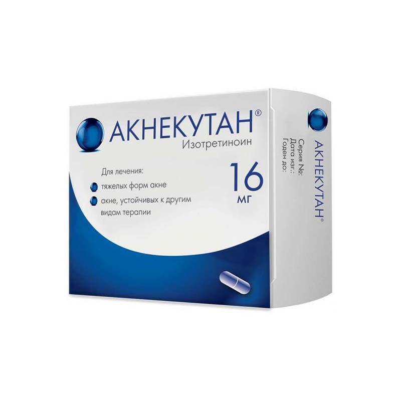 Желатиновые капсулы № 3, с крышкой и корпусом оранжевого цвета (для дозировки 8 мг).Желатиновые капсулы № 1, с крышкой зеленого цвета и корпусом белого цвета (для дозировки 16 мг).Содержимое капсул — воскообразная паста оранжевого цвета. | Состав+Одна капсула содержитизотретиноин 8.00 мг или 16.00 мг | Противопоказания+повышенная чувствительность к изотретиноину или вспомогательным компонентам препарата, включая масло соевое. Препарат противопоказан пациентам с аллергией на сою.сопутствующая терапия тетрациклинамипеченочная недостаточностьгипервитаминоз Агиперлипидемиядетский и подростковый возраст до 18 летбеременность, период лактацииженщины детородного возраста, если не выполнены все условия Программы по предупреждению беременностиС осторожностьюсахарный диабетдепрессия в анамнезеожирениенарушение липидного обменаалкоголизм | Побочные действия+Очень часто (больше или равно 1/10)- анемия, увеличение скорости оседания эритроцитов, тромбоцитопения, тромбоцитоз- блефарит, конъюнктивит, сухость слизистой глаза, раздражение глаза- повышение трансаминаз- хейлит, дерматит, сухость кожи, шелушение кожи ладоней и подошв, зуд,эритематозная сыпь, легкая травмируемость кожи (риск травматизации)- артралгия, миалгия, боль в спине- гипертриглицеридемия, снижение липопротеинов высокой плотностиЧасто (больше или равно 1/100, ‹ 1/10)- нейтропения- головная боль- носовое кровотечение, сухость слизистой носа, ринофарингит- алопеция- гиперхолестеринемия, гипергликемия, гематурия, протеинурияРедко (больше или равно 1/10 000, ‹ 1/1 000)- аллергические кожные реакции, анафилактические реакции, гиперчувствительность- депрессия, усугубление депрессии, тенденции к агрессии, тревога, лабильность настроенияОчень редко (меньше или равно 1/10 000)- инфекции, вызванные грамположительными возбудителями- лимфаденопатия- сахарный диабет, гиперурикемия- расстройство поведения, психоз, суицидальные мысли, попытки к самоубийству, самоубийство- сонливость, повышение внутричерепного давления, судороги- нарушение остроты зрения, катаракта, нарушение цветовосприятия (проходящее после отмены препарата), непереносимость контактных линз, помутнение роговицы, нарушение темновой адаптации (снижение остроты сумеречного зрения), кератит, неврит зрительного нерва (как признак внутричерепной гипертензии), фотофобия- нарушение остроты слуха- васкулиты (гранулематоз Вегенера, аллергический васкулит)- бронхоспазм (особенно у пациентов с астмой), хрипота- колит, илеит, сухость в горле, желудочно-кишечное кровотечение, геморрагическая диарея и воспалительные заболевания желудочно-кишечного тракта, тошнота, панкреатит- гепатит- молниеносные угри, обострение угревой болезни, эритема (лица), экзантема, заболевания волос, гирсутизм, дистрофия ногтей, паронихия, фотосенсибилизация, пиогенная гранулема, гиперпигментация кожи, потливость- артрит, кальциноз (кальцификация связок и сухожилий), преждевременное замыкание зоны роста эпифиза, экзостоз (гиперостоз), снижение плотности кости, тендинит- гломерулонефрит- увеличение гранулематозных тканей, недомогание- увеличение креатинфосфокиназы кровиЧастота неизвестна- рабдомиолиз | Способ применения+Акнекутан должен назначаться только врачом или использоваться под наблюдением врача, имеющего опыт применения системных ретин