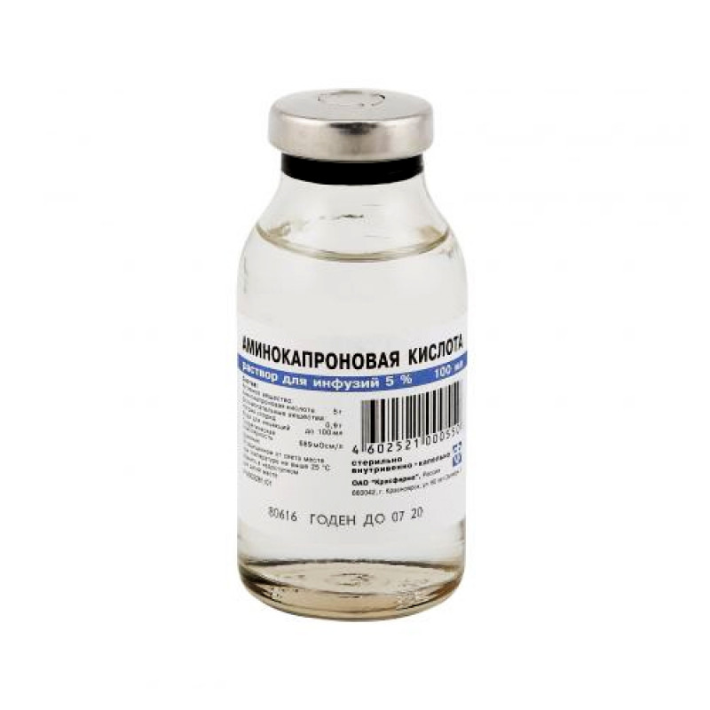 Бесцветная прозрачная жидкость | Состав+100 мл раствора содержат — аминокапроновая кислота 5 г | Противопоказания+- повышенная чувствительность к препарату- склонность к тромбозам и тромбоэмболическим заболеваниям- гиперкоагуляция (тромбообразование, тромбоэмболия)- коагулопатии вследствие диффузного внутрисосудистого свертывания крови- заболевания почек с нарушением выделительной функции- гематурия- беременность- нарушения мозгового кровообращения | Побочные действия+- головокружение, шум в ушах, головная боль- тошнота, диарея- воспаление верхних дыхательных путей, заложенность носа- кожная сыпь- ортостатическая артериальная гипотензия, судороги, субэндокардиальноекровоизлияние, миоглобинурия,- острая почечная недостаточность | Способ применения+Кислота аминокапроновая вводится внутривенно.Суточная доза для взрослых составляет 5-30 г. При необходимости достижения быстрого эффекта (острая гипофибриногенемия) вводят внутривенно капельно до 100 мл стерильного 5 % раствора на изотоническом растворе натрия хлорида со скоростью 50-60 капель в минуту. В течение 1-го часа вводят в дозе 4-5 г, в случае продолжающегося кровотечения — до его полной остановки — по 1 г каждый час не более 8 часов. При продолжающемся кровотечении инфузии повторяют каждые 4 ч.Детям — из расчета 100 мг/кг массы тела в первый час, затем 33 мг/кг/ч, максимальная суточная доза -18 г/м2 поверхности тела.Длительность лечения — 3-14 дней. | Показания к применению+- кровотечения (гиперфибринолиз, гипо- и афибриногенемия)- кровотечения при хирургических вмешательствах на органах, богатыхактиваторами фибринолиза (головном и спинном мозге, легких, сердце,сосуды, щитовидной и поджелудочной железах, предстательной железе)- заболевания внутренних органов с геморрагическим синдромом- преждевременная отслойка плаценты- при длительной задержке в полости матки мертвого плода- осложненный аборт- для предупреждения вторичной гипофибриногенемии при массивныхпереливаниях консервированной крови | МНН: Аминокапроновая кислотаОбъем: 5%Артикул: A01-0000079