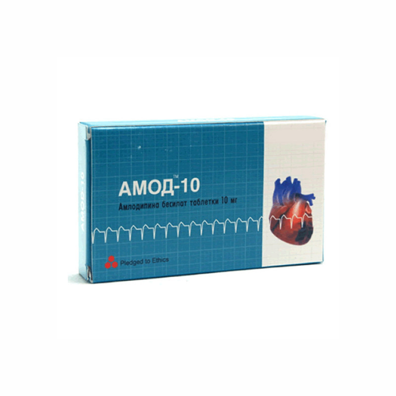 светло-оранжевого цвета, круглые, плоские, непокрытые таблетки с разделительной полоской на одной стороне | Состав+Одна таблетка содержит:амлодипина бесилат эквивалентно амлодипину 10 мг | Противопоказания+повышенная чувствительность к амлодипину и другим компонентам препаратабеременность и период лактации | Побочные действия+головная боль, головокружение, выраженное снижение артериального давления, сонливость, утомляемостьизменение настроения, судороги, редко — потеря сознанияотеки, васкулитпокраснение лица, кожный зуд, сыпь, крапивницасердцебиение, одышкатошнота, рвота, боли в животередко — отек десен, гинекомастия. | Способ применения+Рекомендуемая начальная доза для лечения эссенциальной артериальной гипертензии составляет 5 мг один раз в сутки, максимальная доза — 10 мг один раз в сутки.Рекомендуемая доза для лечения стабильной стенокардии и вазоспастической стенокардии составляет 5-10 мг один раз в сутки.Максимальная суточная доза: 10 мг один раз в сутки.Пациентам с низкой массой тела, ослабленным и пожилым пациентам, а также при печеночной недостаточности начальная доза составляет 2.5 мг один раз в сутки, в частности, если амод назначается в дополнение к другим антигипертензивным препаратам. | Показания к применению+эссенциальная артериальная гипертензиястенокардия напряжениявазоспастическая стенокардия | МНН: АмлодипинОбъем: 10 мгАртикул: A01-0002807
