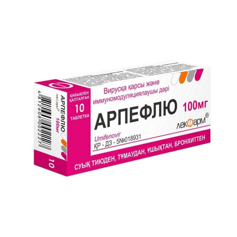 Таблетки, покрытые оболочкой, белого цвета, с двояковыпуклой поверхностью. | Состав+Одна таблетка содержитумифеновира гидрохлорид (в пересчете на 100 % вещество) 50 мг или 100 мг | Противопоказания+- Повышенная чувствительность к любому компоненту препарата- детский возраст до 6 лет- беременность и период лактации-наследственная непереносимость лактозы, лактознаянедостаточность, мальабсорбция глюкозы, галактозы. | Побочные действия+Редко- аллергические реакции (сыпь, анафилактическая реакция)- изжога, тошнота, рвота, диарея. | Способ применения+Внутрь, за 30 минут до приема пищи или через 2 часа после приема пищи. Разовая доза: детям от 6 до 12 лет — 100 мг, старше 12 лет и взрослым — 200 мг (2 таблетки по 100 мг или 4 таблетки по 50 мг).Для неспецифической профилактикиПри непосредственном контакте с больными гриппом и другими острыми респираторно-вирусными инфекциями:- детям от 6 до 12 лет — по 100 мг один раз в день, старше 12 лет и взрослым — по 200 мг один раз в день в течение 10-14 дней.В период эпидемии гриппа и других острых респираторно-вирусных инфекций:- детям от 6 до 12 лет — по 100 мг, старше 12 лет и взрослым — по 200 мг два раза в неделю в течение 3 недель.Для леченияГриппидругие острые респираторно-вирусные инфекции без осложнений:- детям от 6 до 12 лет — по 100 мг, старше 12 лет и взрослым — по 200 мг 4 раза в сутки (каждые 6 часов) в течение 5 дней.В комплексном лечении хронического бронхита, пневмонии,герпетической инфекции:- детям от 6 до 12 лет — по 100 мг, старше 12 лет и взрослым — по 200 мг 4 раза в сутки (каждые 6 часов) в течение 5-7 дней, затем разовую дозу 2 раза в неделю в течение 4 недель.Комплексная терапия острых кишечных инфекций ротавирусной этиологии у детей старше 6 лет:- детям от 6 до 12 лет — по 100 мг, старше 12 лет — по 200 мг 4 раза в сутки (каждые 6 часов) в течение 5 дней.Профилактика послеоперационных инфекционныхосложнений:- детям от 6 до 12 лет — по 100 мг, старше 12 лет и взрослым — по 200 мг однократно за 2 дня до операции, затем в той же дозе однократно на 2 и 5 день после операции. | Показания к применению+- Грипп А и В, острые респираторно-вирусные инфекции (ОРВИ)- в составе комплексной терапии хронического бронхита, пневмонии и рецидивирующей герпетической инфекции- профилактика гриппа и ОРВИ в эпидемический сезон- профилактика послеоперационных инфекционных осложнений- в составе комплексной терапии острых кишечных инфекций ротавирусной этиологии у детей старше 6 лет | МНН: УмифеновирОбъем: 100 мгАртикул: A01-0006898