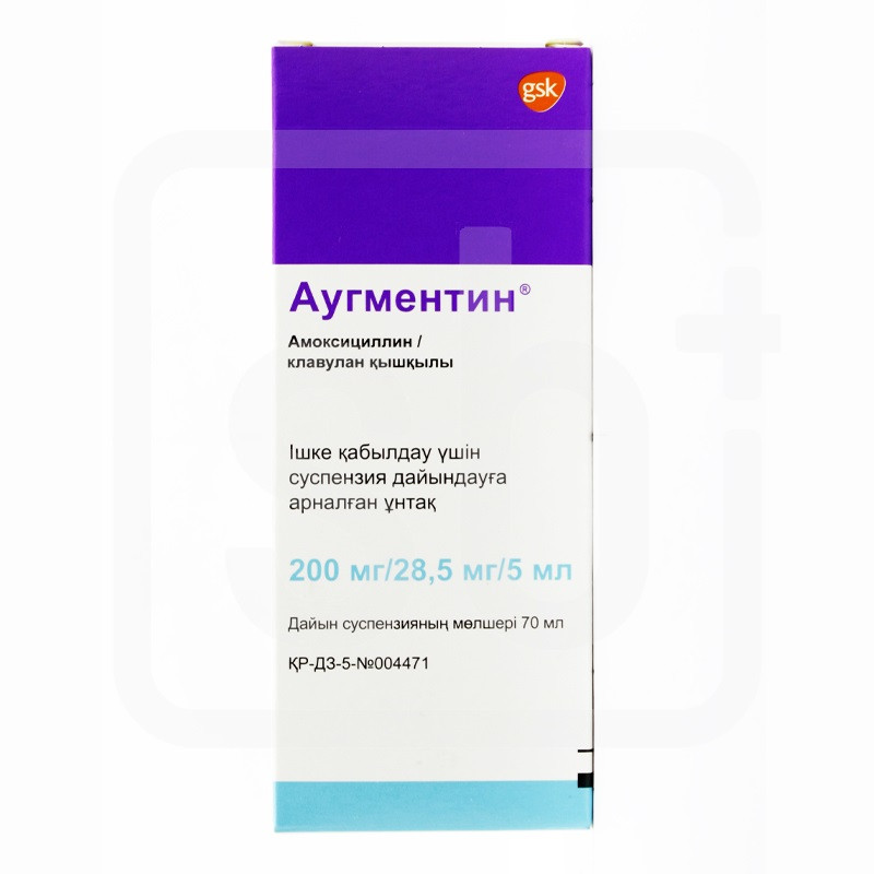 Порошок белого или почти белого цвета. При разведении образуется суспензия белого или почти белого цвета. При стоянии медленно образуется осадок суспензия белого или почти белого цвета. | Состав+5 мл готовой суспензии содержат | Противопоказания+- повышенная чувствительность к бета-лактамам, например, к пенициллинам и цефалоспоринам- желтуха или нарушение функции печени, развившиеся на фоне применения Аугментина или бета-лактамных антибиотиков- инфекционный мононуклеоз. | Побочные действия+- кандидоз- обратимая лейкопения (включая нейтропению), тромбоцитопения, обратимые агранулоцитоз и гемолитическая анемия, увеличение времени кровотечения и индекса протромбинового времени- ангионевротический отек, анафилаксия, синдром, сходный с сывороточной болезнью, аллергический васкулит- головокружение, головная боль, обратимая повышенная активность и судороги- диарея, тошнота, рвота, диспепсия, колит псевдомембранозный или геморрагический, изменение окраски поверхностного слоя зубной эмали- умеренное повышение уровня печеночных ферментов, гепатит, холестатическая желтуха- кожная сыпь, зуд, крапивница, мультиформная эритема, синдром Стивенса-Джонсона, токсический эпидермальный некролиз, буллёзный эксфолиативный дерматит, острый генерализованный экзантематозный пустулёз.- интерстициальный нефрит, кристаллурия. | Способ применения+Режим дозирования устанавливается индивидуально в зависимости от возраста, массы тела, функции почек, а также от степени тяжести инфекции. Аугментин рекомендуется принимать в начале еды. Лечение не следует продолжать более 14 дней без повторной оценки состояния больного. При необходимости возможно проведение ступенчатой терапии (в начале внутривенное введение препарата с последующим переходом на пероральный прием).Дети младше 12 летДозу, в зависимости от возраста и веса, указывают в мг/кг массы тела в сутки, либо в миллилитрах суспензии.Рекомендуемый режим дозирования: 45 мг/кг/сут в 2 приема или 40 мг/кг/сут в 3 приема.Для правильного дозирования объема суспензии у детей младше 3 месяцев рекомендуется пользоваться шприцем с градуировкой.Режим дозирования 20 мг/кг/сут в 3 приема и 25 мг/кг/сут в 2 приема, применяют при лечении инфекций кожи, мягких тканей и рецидивирующего тонзиллита.Режим дозирования 40 мг/кг/сут в 3 приема рекомендуются при синуситах, среднем отите, инфекциях нижних отделов дыхательных путей и мочеполового тракта.Максимальная суточная доза 80-90 мг/кг/сут, разделенной на 3 приема.Способ применения суспензииСуспензия приготавливается непосредственно перед первым применением.Порошок следует растворить кипяченой водой, охлажденной до комнатной температуры, постепенно встряхивая и добавляя воду до метки на флаконе. Затем дать постоять раствору около 5 мин, чтобы обеспечить полное растворение. Флакон следует хорошо встряхивать перед каждым использованием. Для точной дозировки препарата следует использовать мерный колпачок-крышку, который нужно хорошо споласкивать водой после каждого употребления.Пациенты с нарушением функции почекКорректировки доз основаны на максимальной рекомендуемой дозе амоксициллина и значении клиренса креатинина.Корректировки доз основаны на максимальной рекомендуемой дозе амоксициллина.Дети: 15 мг +3,75 мг/кг 1 раз в сутки.Перед сеансом гемодиализа след