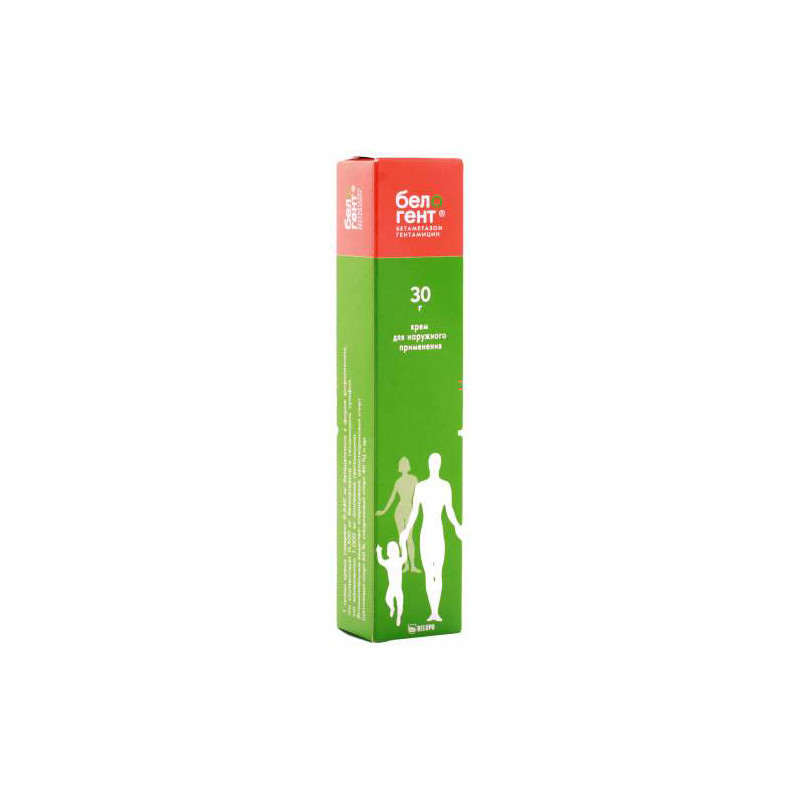 Белая полупрозрачная гомогенная мазь. | Состав+1 г мази содержит:бетаметазона дипропионата 0,640 мг, чтоэквивалентно 0,500 мг бетаметазона, гентамицинасульфата, что эквивалентно 1,000 мг основаниягентамицина | Противопоказания+- гиперчувствительность у пациентов к бетаметазону, гентамицину или клюбому из вспомогательных компонентов препарата- туберкулез кожи- кожные поствакцинальные реакции- открытые раны- ветряная оспа- периоральный дерматит- розацеа и вульгарные угри- трофические язвы | Побочные действия+- гиперчувствительность кожи (сыпь, зуд, эритема, отек и др.)- атрофия кожи, стрии- экхимоз- телеангиэктазии- фолликулит- гипертрихоз- аллергический контактный дерматитПри длительной терапии- кожная сыпь, зуд- местная гиперпигментация или депигментации кожи, депигментации волос- снижение секреции потовых желез- вторичное инфицирование кожиСистемные побочные эффекты- угнетение гипофизарно-надпочечниковой системы- замедление роста, повышение внутричерепного давления- гипергликемия- глюкозурия- синдром КушингаСистемные побочные эффекты при наружном применении бетаметазона происходят вследствие продолжительного лечения, нанесения на большую площадь кожи, нанесения на кожу с нарушенной целостностью, при использовании под окклюзионные повязки. | Способ применения+Только для наружного применения. Белогент в форме мази для наружного применения применяется для терапии хронических дерматозов, в т.ч. сухих, лихенизированных и шелушащихся поражений, или в тех случаях, когда необходимо окклюзионное действие мази.Белогент мазь наносят на пораженный участок тонким слоем в количестве, необходимом для покрытия пораженной поверхности, два раза в день, слегка втирая. На участки с более плотной кожей (например, локти, ладони и стопы), а также места, с которых препарат легко стирается, Белогент можно наносить чаще. Продолжительность непрерывного курса лечения обычно составляет не более 3 недель. Для профилактики рецидивов при лечении хронических заболеваний терапию следует продолжать еще некоторое время до исчезновения всех симптомов, под наблюдением специалиста. | Показания к применению+Заболевания кожи, реагирующие на терапию топическими кортикостероидами, течение которых осложнено бактериальной инфекцией или существует опасность её присоединения:- инфицированные аллергические и неаллергические заболевания кожи: острые, подострые и хронические формы контактного аллергического дерматита, в том числе профессиональный дерматит, себорейный дерматит, пеленочный дерматит, атопический дерматит (нейродерматит), опрелости, экзематозный монетовидный дерматит, дисгидротический дерматит, острый пиодермизированный неаллергический дерматит, острый фотодерматит, рентгеновый дерматит, инфицированные дерматиты, развившиеся в результате укуса насекомых- инфицированные дерматозы, такие как вульгарный псориаз, эксфолиативный дерматит, плоский красный лишай и др.Белогент мазь необходимо применять на поврежденной коже, инфицированной чувствительными к гентамицину бактериями, в т.ч. штаммами Streptococcus spp. (альфа-гемолитический, бета-гемолитический), Staphylococcus aureus (коагулазо-положительные, коагулазо-отрицательные и некоторыми штаммами, продуцирующие пенициллиназу), и грам-отрицательными бактериями Pseudomonas aeruginosa, Aerobacter aerogenes, E. coli, Proteus vulg