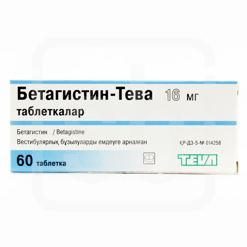 Белые или почти белые, цилиндрические, плоские таблетки, со скошенными кромками, с тиснением «В8» (для дозы 8 мг) или «В16» (для дозы 16 мг) на другой стороне. Белые или грязнобелые круглые, двояковыпуклые таблетки с риской на одной стороне (для дозы 24 мг) | Состав+Одна таблетка содержитбетагистина дигидрохлорид 8 мг, 16 мг, 24 мг | Противопоказания+- повышенная чувствительность к бетагистина гидрохлориду и/или к любому из компонентов препарата- феохромоцитома- бронхиальная астма- беременность и период лактации | Побочные действия+Редко:- головная боль, сонливость- ощущение жара- сердцебиение- боль в подложечной области, изжога, тошнота, рвота- сыпь, крапивница, зуд. | Способ применения+Рекомендованная начальная доза — 24 мг в день в 2-3 приема (по 8 мг бе-тагистина гидрохлорида 3 раза в день или по 16 мг 2 раза в день). Если этой дозировки не достаточно, суточная доза может быть увеличена до 48 мг бета-гистина гидрохлорида. Прдолжительность приема препарата определяется лечащим врачом.Бетагистин не рекомендуются для лечения детей и подростков младше 18 лет. Безопасность и эффективность в данной группе пациентов не была установлена в исследованиях. | Показания к применению+- болезнь Меньера или синдром Меньера- вестибулярные головокружения различного генеза (головокружение с тош-нотой и рвотой, звон в ушах, потеря слуха) | МНН: БетагистинОбъем: 16 мгАртикул: A02-0024166