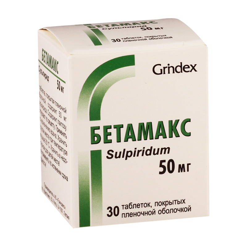 Круглые двояковыпуклые таблетки белого или почти белого цвета, покрытые пленочной оболочкой. На месте разлома белые. | Состав+Одна таблетка содержитсульпирид 50 мг или 100 мг, или 200 мг | Противопоказания+- острое отравление алкоголем, снотворными средствами, анальгетиками- повышенная чувствительность к сульпириду или вспомогательным компонентам препарата- артериальная гипертензия II-III степени- маниакальный психоз- феохромоцитома- болезнь Паркинсона- эпилепсия- пролактинзависимые опухоли (в т.ч. рак молочной железы)- гиперпролактинемия- пациенты в состоянии аффекта и агрессии, у которых существует опасность провокации симптомов- период грудного вскармливания- детский и подростковый возраст до 14 летОтносительные противопоказания к применению Бетамакса:БеременностьНе рекомендуется назначение Бетамакса беременным, за исключением случаев, когда врач, оценив соотношение пользы и риска для беременной и плода, принимает решение о необходимиости применения препарата.Следует также соблюдать меры предосторожности при назначении Бетамакса пациентам с заболеваниями сердца и кровеносных сосудов или удлинением интервала QT в семейном анамнезе. | Побочные действия+Нежелательные явления, развивающиеся в результате приема Бетамакса, подобны нежелательным явлениям, вызываемыми другими психотропными средствами, но частота их развития, в основном, меньше.- обратимая гиперпролактинемия (чаще проявляется как галакторея или нарушение менструального цикла, гинекомастия, импотенция и фригидность), повышенная потливость, увеличение массы тела- лейкопения, гемолитическая анемия, лейкоцитоз- сухость во рту, изжога, рвота, запор- седативный эффект, сонливость, головокружение, редко — экстрапирамидный синдром, дискинезия, оральный автоматизм, афазия, при применении в малых дозах возможны возбуждение, расстройство сна, очень редко — злокачественный нейролептический синдром, в основном, при назначении высоких доз Бетамакса. При развитии гипертермии препарат следует отменить!- повышение артериального давления, редко — развитие ортостатической гипотензии, аритмии, в том числе вентрикулярные аритмии, удлинение интервала QT, аритмия типа torsade de pointes- кожная сыпь, зуд | Способ применения+Не рекомендуется принимать препарат во второй половине дня (после 16.00) в связи с повышением уровня бодрствования.Максимальная рекомендованная суточная доза составляет 1600 мг Бетамакса.Шизофрения, острый делириозный психоз. Начальные дозы Бетамакса зависят от клинической картины заболевания и составляют 600-1200 мг в сутки, разделенные на несколько приемов, поддерживающие дозы — 300-800 мг в сутки.Депрессия. От 150-200 мг до 600 мг в сутки, разделенные на несколько приемов.Головокружение. 150-200 мг/сут, в тяжелых состояниях дозу можно увеличить до 300 400 мг. Продолжительность лечения должна быть не менее 14 дней.Вспомогательная терапия при язвенной болезни желудка и двенадцатиперстной кишки, синдроме раздраженной толстой кишки. 100-300 мг Бетамакса в сутки, в один или два приема.Дозы у пациентов с нарушением функции почек. В связи с тем, что сульпирид выводится из организма преимущественно через почки, рекомендуется уменьшить дозу Бетамакса и/или увеличить интервал между введением отдельных доз препарата в зависимости от показателей клиренса креатинина:Клиренс креатинина, 