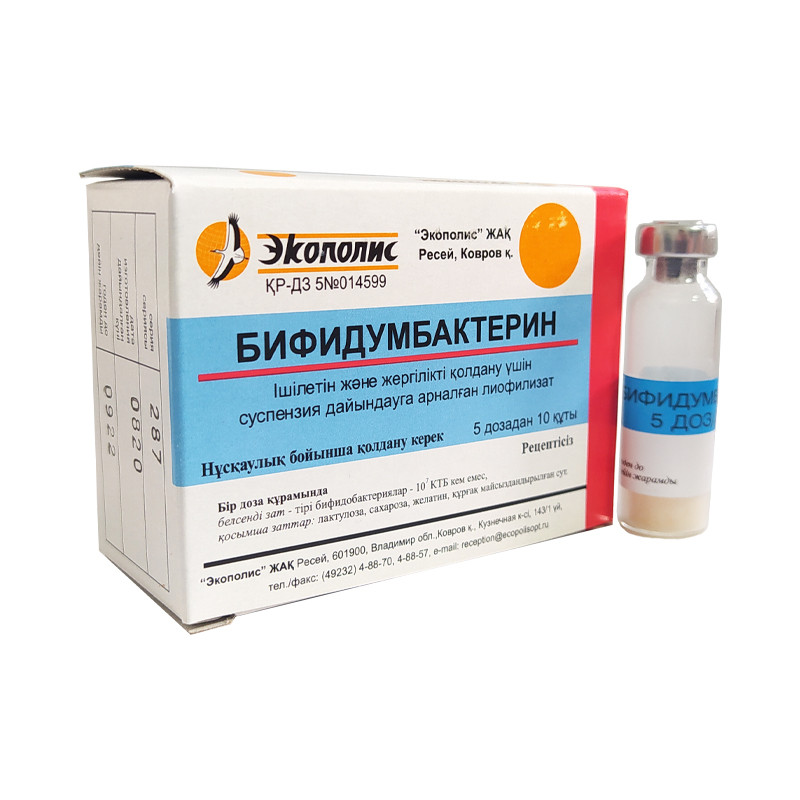 Кристаллическая или пористая масса бежевого или беловато-серого цвета, имеет специфический запах и вкус | Состав+Одна доза содержитбифидобактериии живые не менее 107 | Противопоказания+Не установлены | Побочные действия+Индивидуальная непереносимость | Способ применения+Бифидумбактерин при кишечных заболеваниях применяют внутрь, а в акушерско-гинекологической практике и интравагинально.Содержимое флакона растворяют кипяченой водой комнатной температуры из расчета 5 мл воды (чайная ложка) на 1 дозу препарата.Растворение проводят следующим образом: в стакан наливают необходимое количество воды (в соответствии с количеством доз, указанных на флаконе); удаляют колпачок и пробку и вскрывают флакон; из стакана переносят во флакон небольшое количество воды; после растворения (препарат растворяется не более 5 мин с образованием непрозрачной гомогенной взвеси) содержимое флакона переливают в тот же стакан и перемешивают. Одна чайная ложка растворенного препарата составляет 1 дозу. Растворенный препарат хранению не подлежит.Необходимое количество доз принимают за 20-30 мин до еды. Грудным детям препарат можно давать непосредственно перед кормлением.При кишечных заболеваниях детям первого полугодия жизни препарат назначают по 5 доз на прием 2 раза в день, детям второго полугодия и старше — по 5 доз 3 раза вдень.Новорождённым с отягощённым преморбидным фоном целесообразно начинать применение препарата в родильном отделении с первых суток жизни до выписки по 2,5 дозы на прием 2 раза в день.Детям, больным сепсисом, другими гнойно-инфекционными заболеваниями, пневмониями назначают по 5 доз 3 раза в день в составе комплексной терапии. При возникновении у данной группы детей нарушений функции желудочно-кишечного тракта и угрозы развития язвенно-некротического энтероколита дозировку бифидумбактерина увеличивают до 20 доз в сутки.При острых и хронических воспалительных заболеваниях тонкого и толстого кишечника у взрослых рекомендуется принимать по 5 доз 2-3 раза в день.При кишечных заболеваниях длительность курса лечения бифидумбактерином определяется тяжестью клинических проявлений, возрастом больного и составляет от 2 до 4 недель, а в отдельных случаях до 3-х месяцев.Обработка области соска и ареолы родильниц: растворенным препаратом (5 доз) пропитывают 2 стерильных тампона и прикладывают их к молочной железе на 20-30 минут перед кормлением. Курс лечения 5 дней.При интравагинальном применении пропитанный препаратом стерильный тампон вводят во влагалище и оставляют на 2-3 часа.При воспалительных заболеваниях женских гениталий и предродовой подготовке беременных бифидумбактерин назначают по 5-10 доз 1 раз в день в течение 5-8 дней под контролем восстановления микробиологической чистоты вагинального секрета до I-II степени и исчезновения клинических симптомов воспаления.При необходимости курс лечения бифидумбактерином можно повторить.С профилактической целью назначают по 5доз 1 -2 раза вдень в течение 1-2 недель. | Показания к применению+- длительные кишечные дисфункции неустановленной этиологии, стафилококковой этиологии- длительная дисфункции кишечника после острых кишечных инфекций- острые кишечные инфекции в составе комплексной терапии- пневмония, сепсис, другие гнойно-инфекционные заболевания в составе комплексной терапии- от