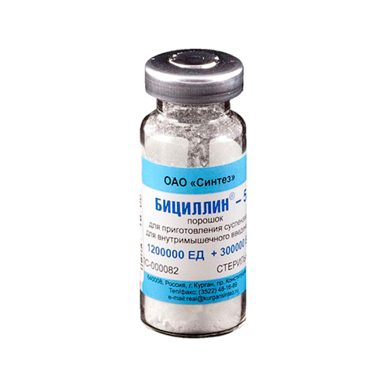 Белый или белый со слегка желтоватым оттенком порошок, склонный к комкованию, образующий при прибавлении воды стойкую суспензию | Состав+Один флакон содержитбензатина бензилпенициллин — 1200000 ЕД,бензилпенициллина новокаиновая соль — 300000 ЕД | Противопоказания+- гиперчувствительность к препарату, бензилпенициллину и другим бета-лактамным антибиотикам- период лактации | Побочные действия+- аллергические реакции: анафилактический шок, анафилактоидные реакции, крапивница, лихорадка, артралгия, ангионевротический отек, мультиформная экссудативная эритема, эксфолиативный дерматит- анемия, тромбоцитопения, лейкопения, гипокоагуляция- стоматит, глоссит | Способ применения+Внутримышечно. Взрослым — по 1200000 ЕД+300000 ЕД 1 раз в 4 недели, детям до 8 лет — 480000 ЕД+120000 ЕД 1 раз в 3 недели, детям старше 8 лет — 960000 ЕД+ 240000 ЕД 1 раз в 4 недели.Для приготовления суспензии используют стерильную воду для инъекций, изотонический раствор натрия хлорида или 0.25-0.5 % раствор прокаина (новокаина).Суспензию Бициллин®-5 готовят асептически, непосредственно перед употреблением (ex tempore): во флакон с препаратом под давлением медленно (со скоростью 5 мл за 20-25 сек) вводят 5-6 мл растворителя. Содержимое флакона перемешивают и встряхивают вдоль продольной оси флакона до образования гомогенной суспензии. Допускается наличие пузырьков на поверхности суспензии у стенок флакона. Суспензию Бициллин®-5 немедленно после приготовления вводят глубоко внутримышечно в верхний наружный квадрант ягодичной мышцы. Растирание ягодичной мышцы после инъекции не рекомендуется. При задержке введения немедленно после приготовления изменяются физические и коллоидные свойства суспензии, в результате чего может затрудняться ее движение через иглу шприца. | Показания к применению+- продолжительная (круглогодичная) профилактика рецидивов ревматизма- сифилис, фрамбезия- острый тонзиллит, скарлатина, раневые инфекции, рожистое воспаление | МНН: Бензатина бензилпенициллинОбъем: 1200000ЕД+300000ЕДАртикул: A02-0001872