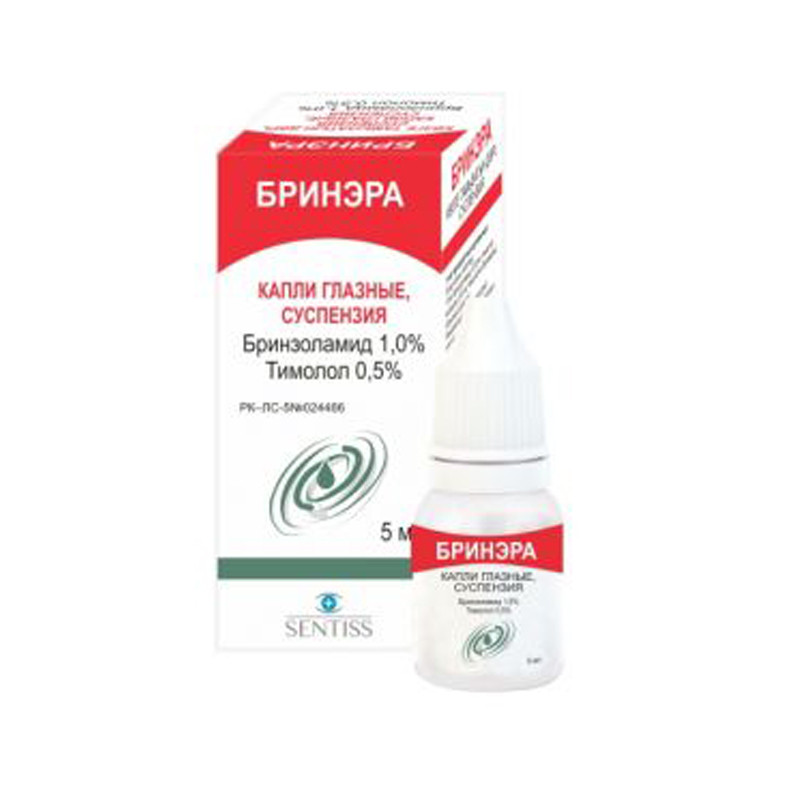 Суспензия белого или почти белого цвета. | Состав+1 мл содержитбринзоламид 10 мг,тимолола малеат 6,83 мг(эквивалентно тимололу 5,0мг) | Противопоказания+Повышенная чувствительность к активным или вспомогательным веществамповышенная чувствительность к другим бета-блокаторамповышенная чувствительность к сульфаниламидамбронхиальная астмахроническое обструктивное заболевание легких тяжелой степенисинусная брадикардиясиндром слабости синусного узласиноатриальная блокадаатриовентрикулярная блокада II и III степенивыраженная сердечная недостаточностькардиогенный шокаллергический ринит тяжелой степенипочечная недостаточность тяжелой степенигиперхлоремический ацидозбеременность и период лактациидетский и подростковый период до 18 лет | Побочные действия+При оценке частоты встречаемости различных побочных реакций использованы следующие градации: очень часто (больше или равно 1 / 10), часто (от больше или равно 1 / 100 до ‹1/10), нечасто (от больше или равно 1 / 1000 до ‹1/100), редко (больше или равно 1 / 10000) до ‹1/1000), очень редко (‹1/10000) или неизвестно (не может быть оценено по имеющимся данным).Нечасто:-кератит, сухость глаза, выделение из глаз, зуд в глазах, ощущение инородного тела в глазах, гиперемия конъюнктивы-снижение артериального давления-повышение уровня калия в крови, повышение лактатдегидрогеназы в крови-кашельРедко:-эрозия роговицы, фотофобия, слезотечение, эритема века, корка краевого века-ринорея, боль в ротоглотке-бессонницаНеизвестно:-назофарингит, фарингит, гайморит, ринит, заложенность носа, сухость в носу, носовое кровотечение, заложенность верхних дыхательных путей, постназальный капельный синдром, чихание-анафилаксия, анафилактический шок, системные аллергические реакции, включая ангионевротический отек, локализованная и генерализованная сыпь, крапивница, эритема, зуд, гипоэстезия-депрессия, потеря или ухудшение памяти, апатия, депрессивное настроение,нервозность, церебральная ишемия, парестезия, тремор, цереброваскулярные нарушения, обморок, сонливость, амнезия, головокружение, головная боль, шум в ушах-сердечная недостаточность, атриовентрикулярная блокада, нерегулярный сердечный ритм, аритмия, сердцебиение, учащение пульса, боль в груди-дыхательная недостаточность, бронхоспазм (преимущественно у пациентов с ранее существовавшим бронхоспастическим заболеванием), одышка, астма, бронхиальная гиперактивность, раздражение горла-рвота, тошнота, боль в животе, диарея, сухость во рту, эзофагит, диспепсия, дискомфорт в животе, желудочно-кишечные расстройства, метеоризм, нарушение функции печени-боль в спине, в конечностях, двигательная дисфункция, увеличение признаков и симптомов миастении-снижение либидо, эректильная дисфункция-гипогликемия | Способ применения+Встряхнуть флакон перед употреблением!Глазные капли БРИНЭРА закапывают в коньюнктивальный мешок по 1 капле 2 раз в день в пораженный глаз (глаза), в одно и то же время.После закапывания рекомендуется прижатие носослезного канала или прикрытие век на 2 минуты. Это снижает системное всасывание лекарственного препарата и служит профилактикой развития неблагоприятных системных реакций.Если доза была пропущена, то лечение должно быть продолжено со следующей дозой по расписанию. Доза не должна превышать 2 капли в день в пораженный глаз (глаза).Не след