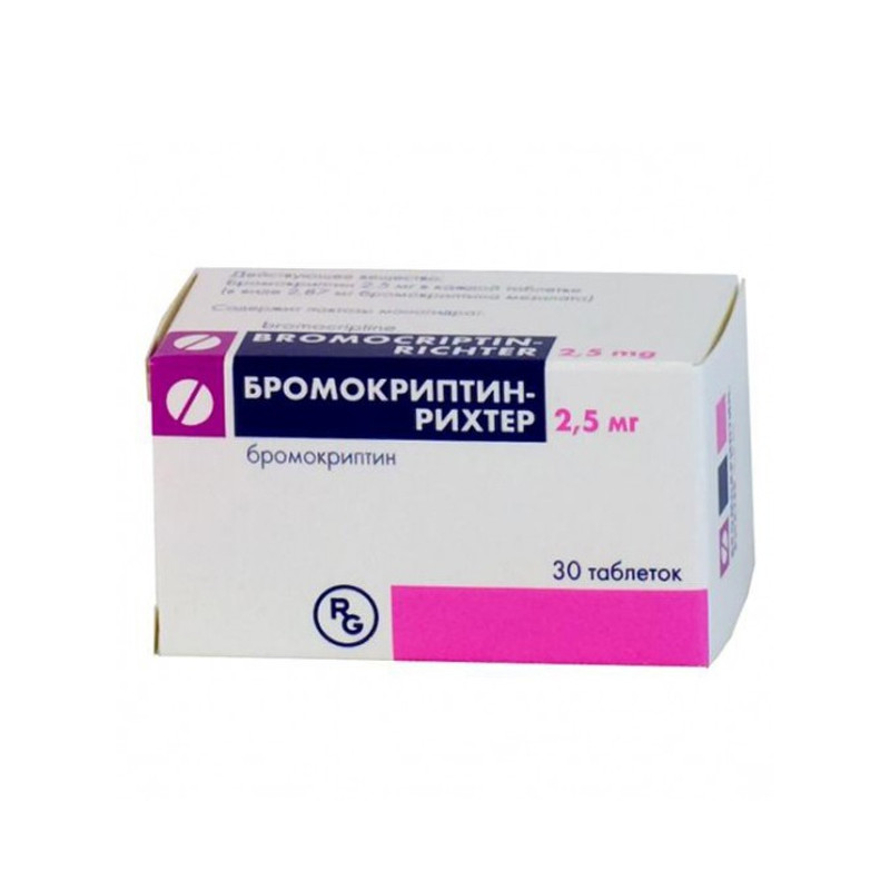 Таблетки почти белого цвета, круглые, плоские, с риской на одной стороне и с гравировкой «2.5»на другой, диаметром около 7 мм. | Состав+Одна таблетка содержитбромокриптин 2,5 мг ( в виде бромокриптина мезилата 2,87 мг) | Противопоказания+- гиперчувствительность к бромокриптину или к другим алкалоидам спорыньи (производным эргокриптина), а также к вспомогательным веществам препарата- гестоз беременных- артериальная гипертензия в родах или в послеродовом периоде- неконтролируемая артериальная гипертензия- язвенная болезнь желудка и 12 перстной кишки- идиопатический или семейный тремор- хорея Геттингтона (Huntington)- тяжелые сердечно — сосудистые заболевания (в том числе ишемическая болезнь сердца) в настоящее время и в анамнезе- заболевания клапанного аппарата сердца-заболевания соединительной ткани, в том числе в анамнезе- тяжелые психические заболевания в настоящее время или в анамнезе- детский и подростковый возраст до 15 лет- наследственная непереносимость галактозы, лактозы, лактазная недостаточность, мальабсорбция глюкозы,галактозы- совместное применение с оральными пероральными контрацептивами- период лактации | Побочные действия+Часто (больше или равно 1/100 до ‹ 1/10)- головная боль, головокружение- отсутствие аппетита- тошнота, запорыНечасто (больше или равно 1/1000 до ‹ 1/100)- спутанность сознания, галлюцинации- дискинезия, психомоторное возбуждение- ортостатическая гипотензия- сухость во рту, рвота- кожная сыпь, аллергический дерматит, алопеция- мышечные спазмы, слабостьРедко (больше или равно 1/10000 до ‹ 1/1000)- бессонница, сонливость, психотические расстройства, парестезии- шум в ушах- перикардиальный выпот, перикардит, тахикардия, брадикардия, аритмия- плевральный выпот, плевральный фиброз, плеврит, одышка- забрюшинный фиброз, желудочно-кишечные кровотечения, язвы на слизистой оболочке желудочно-кишечного тракта- периферические отекиОчень редко (‹ 1/10000)- снижение остроты зрения- злокачественный нейролептический синдром- внезапно наступающий сон в середине дня- патологическое влечение, повышенное либидо и гиперсексуальность- инфаркт миокарда, заболевания клапанного аппарата сердца- инсульт- артериальная гипертензия- бледность кожных покровов, синдром Рейно- гипонатриемия | Способ применения+Таблетки необходимо принимать во время приема пищи (за завтраком или ужином). В большинстве случаев препарат начинают принимать с постепенным повышением дозы до достижения оптимального терапевтического эффекта и минимальных проявлений побочных эффектов. Максимальная доза не должна превышать 30 мг в сутки.Схема приемаНачальная доза препарата 1,25 мг (1/2 таблетки) во время еды, за ужином. Через 2-3 дня дозу Бромокриптина-Рихтера увеличивают до 2,5 мг.В дальнейшем, дозу препарата можно повышать каждые 2-3 дня на 1,25 мг, до достижения суточной дозы 5 мг (по 2,5 мг 2 раза в сутки). При необходимости, дальнейшее повышение дозы препарата можно проводить по этой же схеме.Предупреждение лактацииВ день родов 2,5 мг (1 таблетке) 1 раз в сутки, а в дальнейшем 2 раза в сутки по 2,5 мг Бромокриптина-Рихтера в течение 14 дней. В данном случае нет необходимости в постепенном повышении дозы препарата.Подавление лактацииВ первые сутки необходимо принять 2,5 мг препарата, а в следующие 2-3 дня дозу препарата повышают до 5 мг (по 2,5 мг 2 раза в сутки). Прием препарата продолжают 