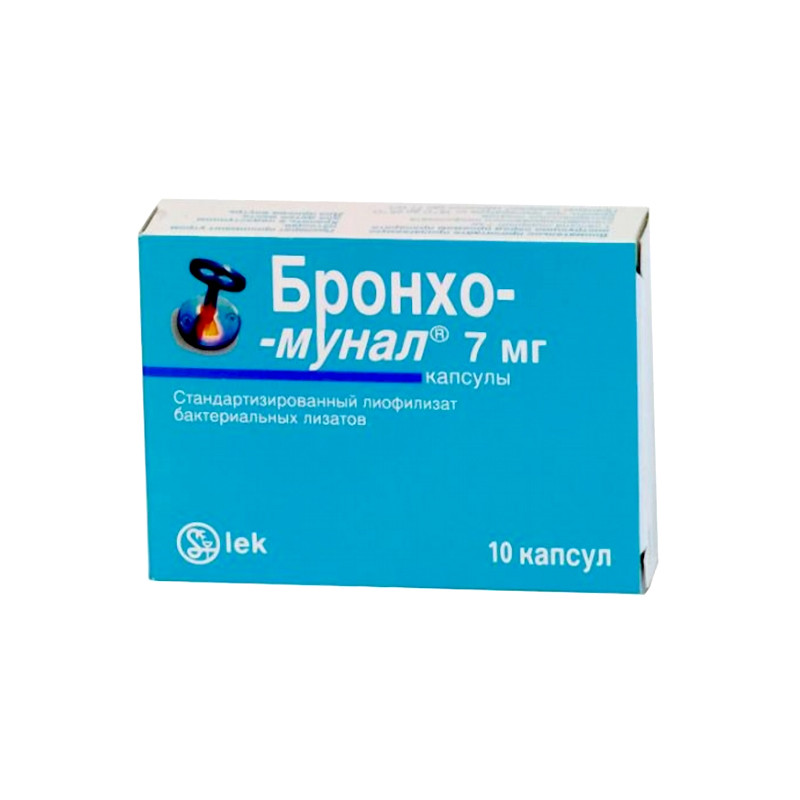 Капсулы 7 мг: непрозрачные капсулы голубого цвета. Капсулы 3,5 мг: белые непрозрачные капсулы с голубой крышкой. | Состав+Одна капсула Бронхо-Мунал® содержитлиофилизированный лизат бактерий 3,5 мг, 7 мг | Противопоказания+- гиперчувствительность к любому из компонентов препарата- детский возраст до 6 месяцев. | Побочные действия+Встречаются крайне редко и в большинстве случаев слабые и преходящие. Среди зарегистрированных побочных эффектов отмечались желудочно-кишечные расстройства (боли в желудке или брюшной полости, тошнота, рвота, понос), повышение температуры тела, а также несколько случаев реакций гиперчувствительности. | Способ применения+Взрослые и дети старше 12 лет:Для профилактики инфекционных заболеваний дыхательных путей назначают по 1 капсуле Бронхо-Мунала® в сутки непрерывно в течение 10 дней каждого из 3-х идущих подряд месяцев. При возможности лечение начинают в один и тот же день каждого из 3-х месяцев, обеспечивая, таким образом, сохранение 20-дневного перерыва между индивидуальными курсами.В острой фазе инфекционного заболевания дыхательных путей следует принимать по 1 капсуле Бронхо-Мунала® в сутки непрерывно в течение 10 — 30 дней. В последующие два месяца следует принимать по 1 капсуле в сутки непрерывно в течение 10 дней каждого месяца. Между курсами должен сохраняться 20-дневный интервал. При необходимости назначения антибиотика Бронхо-Мунал® следует принимать в качестве сопутствующего средства наряду с антибиотиком.Дети от 6 месяцев до 12 лет:Для профилактики инфекционных заболеваний дыхательных путей ребенку следует давать по 1 капсуле Бронхо-Мунала® П в сутки непрерывно в течение 10 дней каждого из 3-х идущих подряд месяцев. При возможности лечение начинают в один и тот же день каждого из 3-х месяцев, обеспечивая, таким образом, сохранение 20-дневного перерыва между индивидуальными курсами.В острой фазе инфекционного заболевания дыхательных путей следует давать ребенку по 1 капсуле Бронхо-Мунала® П в сутки непрерывно в течение 10 — 30 дней. В последующие два месяца можно давать по 1 капсуле в сутки непрерывно в течение 10 дней каждого месяца. Между курсами должен сохраняться 20-дневный интервал. При необходимости назначения антибиотика Бронхо-Мунал® П следует давать в качестве сопутствующего средства наряду с антибиотиком.Для маленьких детей, которые не могут проглотить целую капсулу, рекомендуется ее раскрыть и смешать ее содержимое с небольшим количеством жидкости (чая, молока или сока) и дать ребенку.Лекарство следует принимать утром натощак. | Показания к применению+Бронхо-Мунал® назначается в качестве вспомогательного лекарственного средства при всех заболеваниях дыхательных путей.В качестве профилактического средства Бронхо-Мунал® применяется при хронических инфекционных заболеваниях верхних и нижних дыхательных путей (хронический бронхит, тонзиллит, фарингит, ларингит, ринит, синусит, отит). | Объем: 7 мгАртикул: A02-0000214