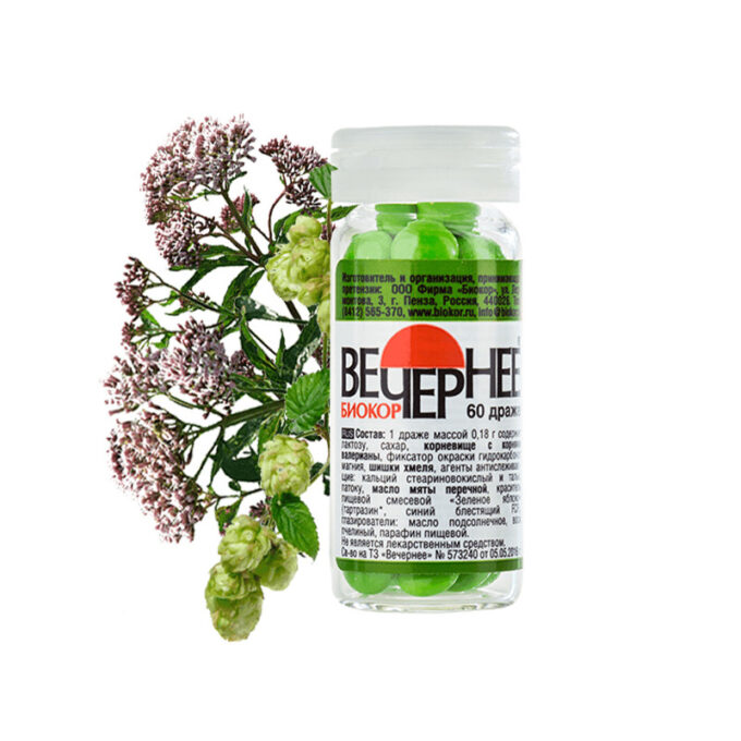 Состав+1 драже массой 0,18 гр содежит лактозу, сахар, корневище с корнями валерианы, гидрокарбонат магния, шишки хмеля | Противопоказания+Индивидуальная непереносимость к компонентов БАД. Перед применением рекомендуется проконсультироваться с врачом. | Способ применения+Взрослым и детям старше 14 лет по 1-2 драже 3 раза в день во время еды в качестве биологически активной добавки к пище, содержащей эфирные масла. Употребление шести драже в день удовлетворяет адекватный уровень потребления эфирных не менее на 150% (не менее 30мг) | Показания к применению+Для реализации населению через аптечную сеть и специализированные магазины, отделы торговой сети в качестве биологически активной добавки к пище — источника флавоноидов. (далее согласно приложению).Драже Вечернее Биокор мягкое успокаивающее средство. Рекомендуется при стрессе, состоянии тревожности, нарушениях сна. Обладает седативным, транквилизирующим, регулирующим сердечную деятельность и умеренными гипотензивными свойствами, является мягким спазмолитическим средством . | Объем: