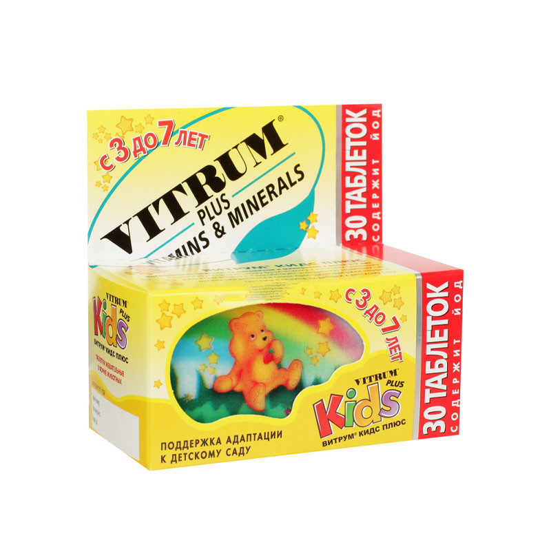 Таблетки жевательные в виде фигурок животных от светло-розового до темно-розового цвета, с небольшими вкраплениями светлого и темного цвета, с легким фруктовым вкусом и запахом. | Состав+Одна таблетка содержит:Витамин А (ретинола ацетат) 2500 МЕ 1)Витамин D3 (колекальциферол) 400 МЕ 2)Витамин Е (dl-альфа токоферола ацетат) 15 МЕ 3)Витамин С (кислота аскорбиновая) 60 мгВитамин В1 (тиамина мононитрат) 1,05 мгВитамин В2 (рибофлавин) 1,2 мгВитамин В6 (пиридоксина гидрохлорид) 1,05 мВитамин В12 (цианокобаламин) 4,5 мкгНикотинамид 13,5 мгБиотин 20 мкгФолиевая кислота 300 мкгКальция пантотенат 5 мгКальций (карбонат кальция) 100 мгМагний (магния фосфат) 40 мгФосфор (магния фосфат) 50 мгЖелезо (железа фумарат) 15 мгМедь (меди оксид) 1 мгЦинк (цинка оксид) 10 мгМарганец (марганца цитрат) 1 мгСелен (натрия селенат) 25 мкгЙод (калия йодид) 150 мкгХром (хрома аминоат) 20 мкг | Противопоказания+- повышенная чувствительность к любому из компонентов препарата- гипервитаминоз А и D- детский возраст до 4-х лет. | Побочные действия+- возможны аллергические реакции на компоненты препарата- окрашивание мочи в интенсивный желтый цвет, что не представляет опасности, так как обусловлено наличием рибофлавина в составе препарата. | Способ применения+Внутрь, после еды, тщательно разжевать таблетку.Детям от 4-х до 7 лет — по 1 таблетке в день.Высшая разовая и высшая суточная доза 1 таблетка.Повторные курсы — по рекомендации врача. | Показания к применению+- профилактика и лечение гиповитаминозов и недостатка минеральных веществ у детей в период интенсивного роста;- период выздоровления после перенесенных заболеваний;- несбалансированное или неполноценное питание, пониженный аппетит | Объем: Таблетки жевательныеАртикул: A02-0000651