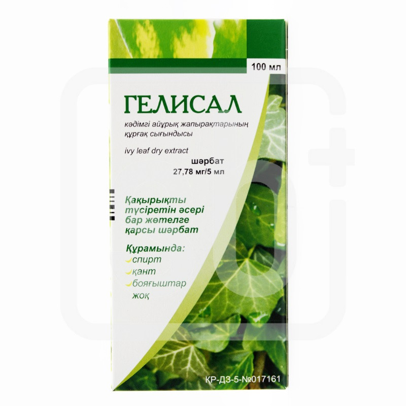 Густоватая жидкость желто-коричневого цвета с анисовым запахом, возможно помутнение и выпадение осадка. | Состав+5 мл сиропа содержатлистьев плюща обыкновенного экстракта сухого (4-8:1) — 27,78 мг; | Противопоказания+- повышенная чувствительность к экстракту из листьев плюща или к компонентам препарата- наследственная непереносимость фруктозы | Побочные действия+- тошнота, рвота, диарея- аллергические реакции. | Способ применения+Внутрь, после еды.Взрослым и детям старшего возраста в неразбавленном виде, детям младшего возраста и грудным разбавляют небольшим количеством воды или сока.Если врач не назначил иначе, сироп принимают по следующей схеме:- взрослым и детям старше 10 лет — по 5 мл (1 мерная ложечка) 3 раза в сутки- детям 5-10 лет — по 2,5 мл (1/2 мерной ложечки) 3 раза в сутки- детям c 1-5 лет — по 2,5 мл (1/2 мерной ложечки) 2 раза в суткиДетям до 1 года можно применять после консультации с врачом в соответствии с его рекомендациями.Не следует превышать рекомендуемую дозу.Продолжительность лечения 7 дней. Рекомендуется продолжение лечения в течение 2-3 дней после исчезновения симптомов заболевания.В упаковке препарата Гелисал находится ложка-дозатор, которая соответствует 5 мл и имеет метки: «1/4» и «1/2», которые соответствуют 1,25 мл и 2,50 мл. | Показания к применению+Инфекционно-воспалительных заболеваний дыхательных путей:- острый и хронический (в т.ч. обструктивный) бронхит- трахеобронхит- бронхиальная астма- бронхоэктатическая болезнь- бронхоспазм, затрудненное отделение мокроты и/или патологическое увеличение ее вязкости, кашель ( в т.ч. сухой). | Объем: 27,78 мг/5 млАртикул: A02-0001951