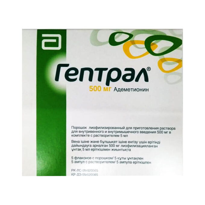 Порошок лиофилизированный — лиофилизированная масса от белого до слегка желтого цвета, свободная от посторонних частиц. Растворитель — прозрачная жидкость от бесцветного до слегка желтоватого цвета, свободная от посторонних частиц, с характерным запахом амина. Приготовленный раствор препарата — прозрачный раствор от светло-желтого до желтого цвета. | Состав+Один флакон содержитадеметионина 1,4-бутандисульфонат 949 мг (эквивалентно 500 мг катиона адеметионина) | Противопоказания+- Повышенная чувствительность к какому-либо компоненту препарата- Пациенты с генетическим дефектом, влияющим на метаболизм метионина и/или гомоцистинурией и/или гипергомоцистеинемией (например, дефицитом фермента цистатион бета-синтетазы, дефектом метаболизма витамина В12) | Побочные действия+Побочные действия из клинических исследованийЧасто(больше или равно 1/100, ‹1/10)- тошнота, боли в животе, диареяНе всегда для развившихся побочных явлений было возможным установить причинную связь с препаратом.- инфекции мочевыводящих путей- спутанность сознания, бессонница- головокружение, головная боль, парестезии- кардиоваскулярные расстройства- «приливы», поверхностный флебит- тошнота, рвота, сухость во рту, эзофагит, желудочно-кишечные расстройства, боль в животе, диспепсия, метеоризм (вздутие живота), желудочно-кишечная боль, диарея, желудочно-кишечное кровотечение- печеночная колика, цирроз печени- гипергидроз, зуд, кожная сыпь- артралгии, мышечные судороги- астения, озноб, гриппоподобные симптомы, недомогание, периферические отеки, гипертермияПостмаркетинговые сообщения (при практическом применении)- реакции в месте введения (очень редко некроз кожи в месте введения), отек Квинке, аллергические кожные реакции (такие как, сыпь, зуд, крапивница, эритема),- гиперчувствительность, анафилактоидные реакции или анафилактические реакции (такие как, гиперемия, одышка, бронхоспазм, боль в спине, дискомфорт в груди, изменения артериального давления (гипотензия, гипертензия) или изменения частоты пульса (тахикардия, брадикардия),- отек гортани,- тревожность | Способ применения+Лечение может быть начато с парентерального введения препарата (внутривенно медленно или внутримышечно) с последующим применением препарата в форме таблеток или сразу с применения таблеток.Лиофилизированный порошок растворяют в специальном растворителе непосредственно перед применением. Неиспользованный остаток выбросить.Гептрал не следует смешивать со щелочными растворами, или с растворами, содержащими ионы кальция. Не следует применять порошок в случае изменения его цвета от первоначального от белого до желтоватого (вследствие повреждения флакона или нагрева). Внутривенное введение проводят очень медленно.ВзрослымНачальная терапия (парентеральное введение): Рекомендуемая доза составляет 5-12 мг/кг/сутки внутривенно или внутримышечно на протяжении первых 2 недель. Обычная начальная доза составляет 500 мг в сутки. Суточная доза не должна превышать 1000 мг. Длительность начальной терапии — 15-20 дней при лечении депрессивного синдрома, 14 дней — при лечении внутрипеченочного холестаза при прецирротических состояниях и циррозе печени, внутрипеченочного холестаза у беременных в III триместре.При проведении начальной терапии Гептралом в форме таблеток (пероральный прием): Рекоменду