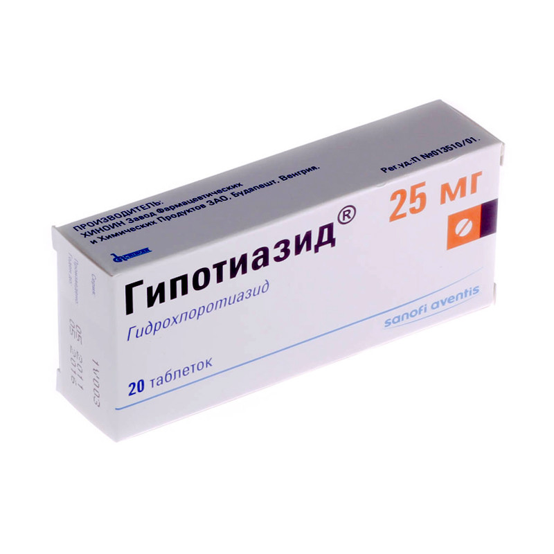 Белые или почти белые плоские таблетки. На одной стороне имеется маркировка «Н», на другой — делительная линия | Состав+Одна таблетка содержитгидрохлоротиазид 25 мг или 100 мг | Противопоказания+- повышенная чувствительность к препарату или к другим сульфонамидам- тяжелая почечная (клиренс креатинина ниже 30 мл/мин) или печеночная недостаточность- анурия- период лактации. | Побочные действия+- гипокалиемия, гипомагниемия, гиперкальциемия и гипохлоремический алкалоз: сухость во рту, жажда, аритмии сердца, изменения в настроении или психике, судороги и боли в мышцах, тошнота, рвота, необычная усталость или слабость. Гипохлоремический алкалоз может вызывать печеночную энцефалопатию или печеночную кому.- гипонатриемия: спутанность сознания, конвульсии, летаргия, возбудимость, мышечные судороги- гипергликемия, глюкозурия, гиперурикемия, которая может вызывать у бессимптомных подагрических больных приступ подагры- манифестация латентного сахарного диабета- повышение уровня липидов крови при применении больших доз- холецистит или панкреатит, холестатическая желтуха, диарея, сиаладенит, запоры, анорексия- аритмии, ортостатическая гипотензия, васкулит- головокружение, временная нечеткость зрения, головная боль, парестезия- очень редко: лейкопения, агранулоцитоз, тромбоцитопения, гемолитическая анемия, апластическая анемия- крапивница, пурпура, некротический васкулит, синдром Стивенса-Джонсона, синдром респираторного дистресса (включая пневмонит и некардиогенный отек легкого), светочувствительность, анафилактические реакции вплоть до шока- нарушения половой функции, пневмонит, нарушение функции почек, интерстициальный нефрит. | Способ применения+Дозировка должна быть подобрана индивидуально и требует постоянного врачебного контроля. В связи с усиленной потерей калия и магния в ходе лечения (уровень калия в сыворотке крови может опускаться ниже 3,0 ммоль/л), возникает необходимость в их своевременном возмещении. Особую осторожность следует соблюдать у больных с сердечной недостаточностью, с нарушенной функцией печени или у получающих лечение гликозидами наперстянки. Таблетки следует принимать после еды.ВзрослыеВ качестве антигипертензивного средства, рекомендуемая начальная суточная доза составляет 25-100 мг в один прием, в виде монотерапии или в комбинации с другими гипотензивными препаратами. Некоторым больным достаточно начальной дозы в 12,5 мг, как в форме монотерапии, так и в комбинации. Необходимо применять минимальную эффективную дозу, не превышающую 100 мг в сутки. Если Гипотиазид комбинируется с другими гипотензивными препаратами, может возникнуть необходимость в снижении их доз для предупреждения чрезмерного гипотензивного эффекта. Гипотензивное действие проявляется в течение 3 — 4 дней, однако для достижения оптимального эффекта может потребоваться до 3 — 4 недель.После окончания лечения гипотензивный эффект сохраняется до недели. При несахарном диабете рекомендуемая суточная доза составляет 50-150 мг (в 2 — 4 приема).Рекомендуемая доза при лечении отеков — 25-100 мг препарата один раз в сутки или раз в два дня. В зависимости от клинической реакции доза должна быть снижена до 25 — 50 мг один раз в сутки или раз в два дня. В некоторых тяжелых случаях могут потребоваться начальные дозы до 200 мг в сутки.При отеках в пред