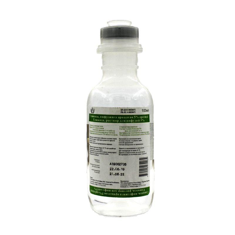 Бесцветная прозрачная жидкость. | Состав+1 л препарата содержитглюкоза безводная 50.0 г или 100.0 г | Противопоказания+- сахарный диабет- гипергликемия- гиперлактацидемия- гиперосмолярная кома- циркуляторные нарушения- отек мозга, отек легких, острая левожелудочковая недостаточность- послеоперационные нарушения утилизации глюкозы- гипергидрация- повышенная чувствительность к компонентам препарата | Побочные действия+- гипергликемия- лихорадка- тошнота, полидипсия- гиперволемия- острая левожелудочковая недостаточность- нарушения ионного баланса (гипокалиемия, гипофосфатемия, гипомагниемия, гипонатриемия)- истощение инсулярного аппарата поджелудочной железы- легкая боль в местах введения- тромбофлебит- аллергические реакции (кожные высыпания, ангионевротический оттек, анафилактический шок) | Способ применения+Изотонический (5%) раствор вводят внутривенно капельно с максимальной скоростью 7 мл/мин (150 капель в 1 мин или 400 мл/ч).Максимальная суточная доза для взрослых — 2 л. В случаях резкого обезвоживания организма возможно введение 3-5 литров раствора глюкозы в сутки.Доза глюкозы зависит от индивидуальных потребностей организма. У взрослых с нормальным обменом веществ суточная доза вводимой глюкозы не должна превышать 4-6 г/кг/сут, т.е. около 250-450 г/сут., при этом объем вводимой жидкости составляет 30-40 мл/кг/сут. При снижении интенсивности обмена веществ суточную дозу уменьшают до 200-300г.Продолжительное введение препарата следует осуществлять под контролем концентрации глюкозы в сыворотке крови. Гипертонический раствор (l0%) вводят только внутривенно по 20-40-50 мл. При необходимости вводят капельным методом до 300 мл в сутки.Для более быстрого и полного усвоения глюкозы иногда одновременно вводят инсулин (по 4-5 ЕД под кожу). | Показания к применению+- быстрое восполнение объема жидкости при клеточной, внеклеточной и общей дегидратации- токсикоинфекции, различные интоксикации- шок, коллапс (как компонент кровезаменяющих и противошоковых жидкостей)- гипогликемия- для приготовления растворов лекарственных средств для в/в введения | МНН: ДекстрозаОбъем: 5 %Артикул: A02-0003309
