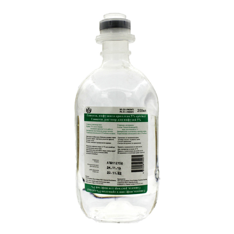 Бесцветная прозрачная жидкость. | Состав+1 л препарата содержитглюкоза безводная 50.0 г или 100.0 г | Противопоказания+- сахарный диабет- гипергликемия- гиперлактацидемия- гиперосмолярная кома- циркуляторные нарушения- отек мозга, отек легких, острая левожелудочковая недостаточность- послеоперационные нарушения утилизации глюкозы- гипергидрация- повышенная чувствительность к компонентам препарата | Побочные действия+- гипергликемия- лихорадка- тошнота, полидипсия- гиперволемия- острая левожелудочковая недостаточность- нарушения ионного баланса (гипокалиемия, гипофосфатемия, гипомагниемия, гипонатриемия)- истощение инсулярного аппарата поджелудочной железы- легкая боль в местах введения- тромбофлебит- аллергические реакции (кожные высыпания, ангионевротический оттек, анафилактический шок) | Способ применения+Изотонический (5%) раствор вводят внутривенно капельно с максимальной скоростью 7 мл/мин (150 капель в 1 мин или 400 мл/ч).Максимальная суточная доза для взрослых — 2 л. В случаях резкого обезвоживания организма возможно введение 3-5 литров раствора глюкозы в сутки.Доза глюкозы зависит от индивидуальных потребностей организма. У взрослых с нормальным обменом веществ суточная доза вводимой глюкозы не должна превышать 4-6 г/кг/сут, т.е. около 250-450 г/сут., при этом объем вводимой жидкости составляет 30-40 мл/кг/сут. При снижении интенсивности обмена веществ суточную дозу уменьшают до 200-300г.Продолжительное введение препарата следует осуществлять под контролем концентрации глюкозы в сыворотке крови. Гипертонический раствор (l0%) вводят только внутривенно по 20-40-50 мл. При необходимости вводят капельным методом до 300 мл в сутки.Для более быстрого и полного усвоения глюкозы иногда одновременно вводят инсулин (по 4-5 ЕД под кожу). | Показания к применению+- быстрое восполнение объема жидкости при клеточной, внеклеточной и общей дегидратации- токсикоинфекции, различные интоксикации- шок, коллапс (как компонент кровезаменяющих и противошоковых жидкостей)- гипогликемия- для приготовления растворов лекарственных средств для в/в введения | МНН: ДекстрозаОбъем: 5 %Артикул: A02-0004239