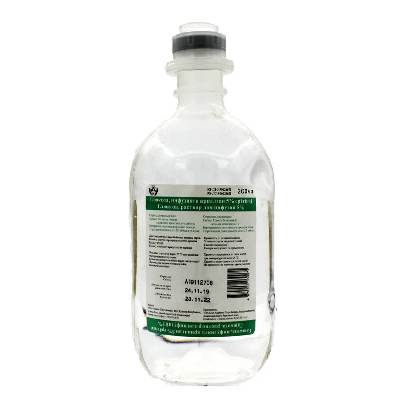 Бесцветная прозрачная жидкость. | Состав+1 л препарата содержитглюкоза безводная 50.0 г или 100.0 г | Противопоказания+- сахарный диабет- гипергликемия- гиперлактацидемия- гиперосмолярная кома- циркуляторные нарушения- отек мозга, отек легких, острая левожелудочковая недостаточность- послеоперационные нарушения утилизации глюкозы- гипергидрация- повышенная чувствительность к компонентам препарата | Побочные действия+- гипергликемия- лихорадка- тошнота, полидипсия- гиперволемия- острая левожелудочковая недостаточность- нарушения ионного баланса (гипокалиемия, гипофосфатемия, гипомагниемия, гипонатриемия)- истощение инсулярного аппарата поджелудочной железы- легкая боль в местах введения- тромбофлебит- аллергические реакции (кожные высыпания, ангионевротический оттек, анафилактический шок) | Способ применения+Изотонический (5%) раствор вводят внутривенно капельно с максимальной скоростью 7 мл/мин (150 капель в 1 мин или 400 мл/ч).Максимальная суточная доза  для взрослых — 2 л. В случаях резкого обезвоживания организма возможно  введение  3-5  литров  раствора  глюкозы  в  сутки.Доза глюкозы зависит от индивидуальных потребностей организма. У взрослых с нормальным обменом веществ суточная доза вводимой глюкозы не должна превышать 4-6 г/кг/сут, т.е. около 250-450 г/сут., при этом объем вводимой жидкости составляет 30-40 мл/кг/сут. При снижении интенсивности обмена веществ суточную дозу уменьшают до 200-300г.Продолжительное введение препарата   следует осуществлять под контролем концентрации глюкозы в сыворотке крови. Гипертонический раствор (l0%) вводят только внутривенно по 20-40-50 мл. При необходимости вводят капельным методом до 300 мл в сутки.Для более быстрого и полного усвоения глюкозы иногда одновременно вводят инсулин (по 4-5 ЕД под кожу). | Показания к применению+- быстрое восполнение объема жидкости при клеточной, внеклеточной и общей дегидратации- токсикоинфекции, различные интоксикации- шок, коллапс (как компонент кровезаменяющих и противошоковых жидкостей)- гипогликемия- для приготовления растворов лекарственных средств для в/в введения | МНН: ДекстрозаОбъем: