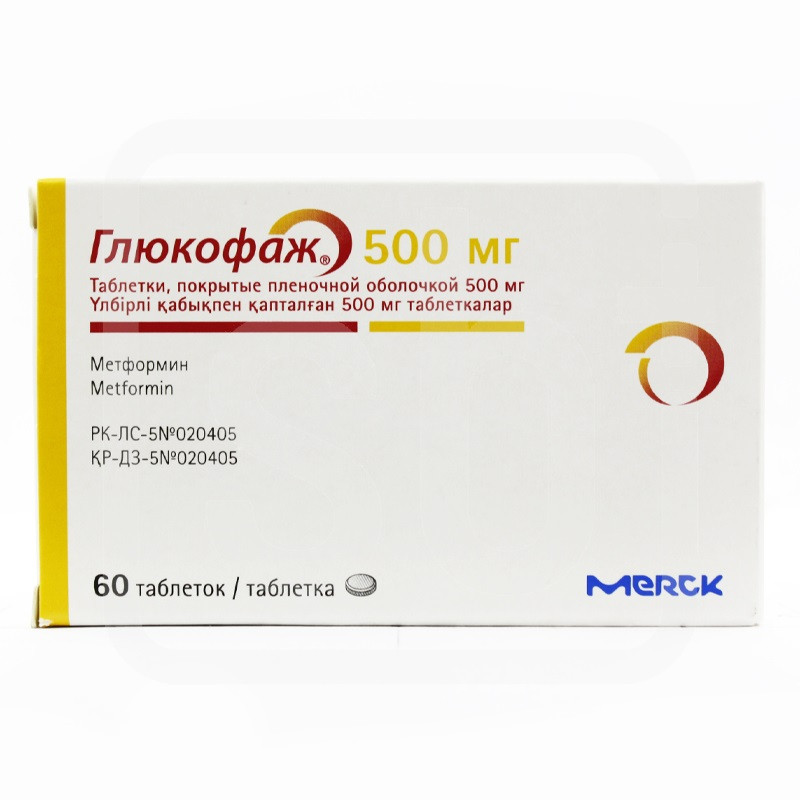 Глюкофаж® 500 мг и 850 мг: белые, круглые, двояковыпуклые таблетки, покрытые пленочной оболочкой. Глюкофаж® 1000 мг: белые, овальные, двояковыпуклые таблетки, покрытые пленочной оболочкой с делительной насечкой с обеих сторон и гравировкой «1000» на одной стороне. | Состав+Одна таблетка содержитметформина гидрохлорид 500 мг, 850 мг или 1000 мг | Противопоказания+- повышенная чувствительность к метформина гидрохлориду или к любому вспомогательному веществу- диабетический кетоацидоз, диабетическое предкоматозное состояние, кома- почечная недостаточность или нарушение почечной функции (уровень клиренс креатинина менее 60 мл/мин в моче)- обезвоживание организма, тяжёлая инфекция, гипогликемический шок, внутривенное введение йодированных контрастных веществ, которые могут привести к нарушению почечной функции- сердечные или респираторные нарушения с гипоксией тканей- недавно перенесённый инфаркт миокарда- алкоголизм и острая алкогольная интоксикация- анемия- печеночная недостаточность- беременность, период лактации- применение в течение не менее 2-х дней до и в течение 2-х дней после проведения радиоизотопных или рентгенологических исследований с введением йодсодержащего контрастного вещества | Побочные действия+Очень часто- потеря аппетита, тошнота, рвота, боли в животе и диареяЧасто- нарушение вкусаОчень редко- кожные реакции (зуд, эритема, сыпь)- молочнокислый ацидоз- гепато-билиарные расстройства (транзиторные повышения трансаминаз) | Способ применения+Взрослые: Монотерапия и комбинированная терапия в сочетании с другими пероральными противодиабетическими средствами:Обычная начальная доза составляет одну таблетку 2-3 раза в сутки после или во время приема пищи.Через 10-15 дней проведённого лечения дозу необходимо скорректировать на основании результатов измерения глюкозы крови. Медленное увеличение дозы может способствовать улучшению желудочно-кишечной переносимости.Пациентам, которые назначены высокие дозы препарата (2000-3000 мг в день), рекомендуется прием Глюкофажа c дозировкой 1000 мг. Максимальная рекомендованная доза составляет 3000 мг в сутки (по 1 таблетке Глюкофажа по 1000 мг в три приема).В случае планирования перехода с приёма другого противодиабетического средства: необходимо прекратить приём другого средства и начать приём препарата Глюкофаж в дозе, указанной выше.Комбинация с инсулином:Для достижения лучшего контроля глюкозы в крови Глюкофаж и инсулин можно применять в виде комбинированной терапии. Обычная начальная доза препарата Глюкофаж 500 мг или 850 мг составляет одну таблетку 2-3 раза в сутки, Глюкофаж 1000 мг -1 таблетка один раз в сутки, в то время как дозу инсулина подбирают на основании результатов измерения глюкозы в крови.Дети и подростки:У детей с 10 -летнего возраста Глюкофаж может применяться как при монотерапии, так и в сочетании с инсулином. Обычная начальная доза составляет 500 мг 2-3 раза в сутки после или во время приема пищи. Через 10-15 дней проведенного лечения дозу необходимо скорректировать на основании результатов измерения глюкозы крови. Медленное увеличение дозы может улучшать желудочно-кишечную переносимость. Максимальная рекомендованная доза составляет 2000 мг Глюкофаж в сутки, разделенная на 2-3 приема.Пациенты старческого возраста: из-за возможного снижения почечной функции у лиц старческого во