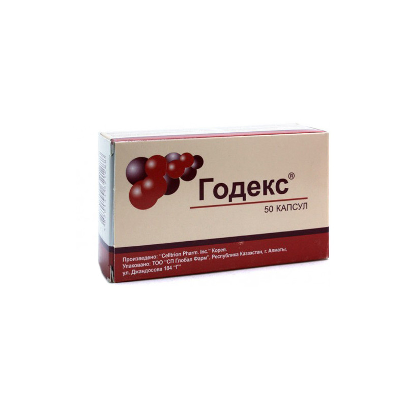 Твердые желатиновые капсулы с корпусом и крышечкой красно-коричневого цвета с маркировкой «GODEX» и «CELLTRION»; содержимое капсул ? желто-коричневый гранулированный порошок. | Состав+Одна капсула содержиткарнитина оротат (в т. ч. кислоты оротовой 73,8и карнитина 76,2) — 150 мгантитоксическая фракция экстракта печени (в т. ч.цианокобаламина 0,125) — 12,5 мгаденина гидрохлорид — 2,5 мгпиридоксина гидрохлорид — 25 мгцианокобаламин — 0,125 мгрибофлавин — 0,5 мгбифенилдиметилдикарбоксилат — 25 мг | Противопоказания+- индивидуальная непереносимость компонентов препарата- детский и подростковый возраст до 18 лет | Побочные действия+- кожная сыпь, крапивница- боли в животе, тошнота, рвота, диарея | Способ применения+Годекс назначается внутрь взрослым по 2 капсулы 2-3 раза в день, независимо от приема пищи.Максимальная разовая доза 2 капсулы, максимальная суточная доза составляет 6 капсул.Рекомендуется применять препарат не менее 2 месяцев.Дальнейшая продолжительность лечения определяется лечащим врачом. | Показания к применению+В составе комплексной терапии- острый, хронический гепатит- цирроз печени- жировая дистрофия печени (стеатоз печени)- алкогольная болезнь печени- лекарственные поражения печени вследствие длительного приема противоопухолевых, противотуберкулезных и других препаратов | Артикул: A02-0000038