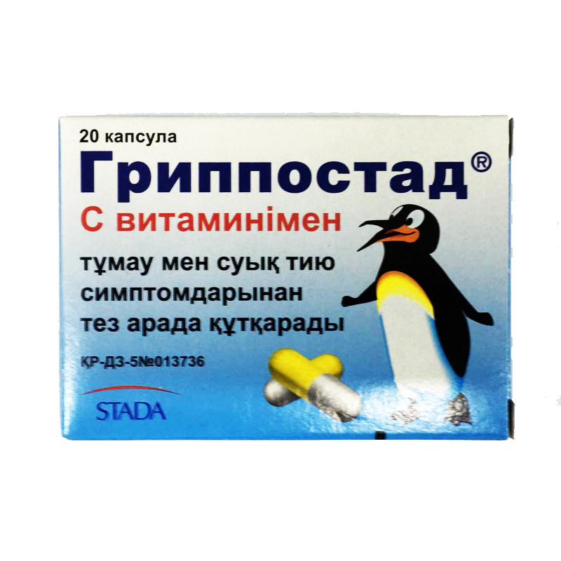 Твердые желатиновые капсулы размером №1, с непрозрачной желтой крышечкой и непрозрачным белым корпусом. Содержимое капсул — белый или желтоватый порошок | Состав+Одна капсула содержитпарацетамол DS 208 мг(содержащий парацетамол 200 мг, желатин 8 мг)кислота аскорбиновая FS 160 мг(содержащая кислоту аскорбиновую 150 мг,глицерола тристеарат 10 мг)кофеин 25 мгхлорфенамина малеат 2,5 мг, | Противопоказания+- гиперчувствительность к компонентам препарата- тяжелые нарушения функции почек- тяжелые нарушения функции печени (Child-Pugh › 9)- наследственная непереносимость галактозы, дефицит лактазы Лаппа, мальабсорбция глюкозы и галактозы- детский возраст до 12 лет- беременность и период лактации | Побочные действия+Часто (большео или равно 1/100 — ‹1/10):- сухость во рту.Нечасто (большео или равно 1/1000 — ‹1/100):- кожные аллергические реакции (эритематозные или уртикарные высыпания)- повышение температуры тела (лекарственная лихорадка)- поражения слизистых оболочек.Редко (большео или равно 1/10000 — ‹1/1000):- повышение уровня печёночных трансаминаз.Крайне редко (‹1/10000):- изменения картины крови: лейкопения, нейтропения, агранулоцитоз, тромбоцитопения, тромбоцитопеническая пурпура, панцитопения, апластическая анемия, при приёме препарата в больших дозах — метгемоглобинемия- дискинезия- развитие глаукомы (закрытоугольная глаукома), нарушения зрения- бронхоспазм (анальгетическая астма) у предрасположенных пациентов- реакции со стороны желудочно-кишечного тракта- нарушения мочеиспускания- повышение аппетита- тяжёлые реакции гиперчувствительности на парацетамол, такие как сосудистый отёк, одышка, повышенное потоотделение, тошнота, падение артериального давления вплоть до нарушений циркуляции и анафилактического шока, в отдельных случаях наблюдалась временная взаимосвязь между приёмом препарата и развитием буллёзных кожных реакций, таких как синдром Стивенса-Джонсона и токсический эпидермальный некролиз (синдром Лайелла)- нарушения функции печени (при продолжительном использовании или передозировке)- психотические реакции.Единичные случаи:- приём парацетамола может влиять на результаты определения мочевой кислоты в крови с помощью фосфорно-вольфрамовой кислоты и определение уровня глюкозы в крови методом глюкозо-оксидазы-пероксидазы- после приёма аскорбиновой кислоты в дозе 1 г концентрация аскорбиновой кислоты в моче может повыситься таким образом, что будет затруднена оценка различных клинико-химических параметров (глюкозы, мочевой кислоты, креатинина и неорганических фосфатов), а также может быть получен недостоверный отрицательный результат при анализе на обнаружение крови в кале. В целом после приема аскорбиновой кислоты может быть затруднена оценка результатов химических методов, основанных на цветной реакции;- хлорфенамина малеат может влиять на результаты кожных тестов на аллергены- нарушения сердечного ритма (тахикардия)- седативное действие, дремотное состояние. | Способ применения+Взрослым и подросткам старше 12 лет Гриппостад® назначают по 2 капсулы 3-4 раза в день. Максимальная суточная доза не должна превышать 12 капсул.У пациентов с нарушениями функции печени или почек, а также с синдромом Жильбера необходимо снизить дозу препарата или увеличить интервал между приёмами.Капсулы принимают, запивая их достаточным количеством 