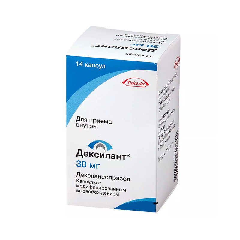 Капсулы с непрозрачной синей крышечкой и с непрозрачным серым корпусом. На крышечку тёмно-серыми чернилами нанесен логотип «ТАР», на корпус — надпись «30». Содержимое капсул — гранулы от белого до почти белого цвета( для дозировки 30 мг)Капсулы с непрозрачными синей крышечкой и корпусом. На крышечку тёмно-серыми чернилами нанесен логотип «ТАР», на корпус — надпись «60». Содержимое капсул — гранулы от белого до почти белого цвета (для дозировки 60 мг) | Состав+Одна капсула содержитдекслансопразол 30 мг или 60 мг | Противопоказания+повышенная чувствительность к любому из компонентов препаратасовместное применение с атазановиромдетский и подростковый возраст до 18 летбеременность, период лактацииПрепарат содержит сахарозу, поэтому его применение не рекомендовано пациентам с наследственной непереносимостью фруктозы, глюкозо-галактозной мальабсорбцией или сахаразно-изомальтазной недостаточностью. | Побочные действия+Наиболее частыми (не менее 2 %) нежелательными побочными реакциями являются диарея, метеоризм, боли в животе, тошнота, рвота, инфекции верхних дыхательных путей.Ниже приводятся данные о нежелательных побочных реакциях в зависимости от частоты их возникновения:Очень часто больше или равно 1/10Часто больше или равно 1/100 и ‹ 1/10Нечасто больше или равно 1/1000 и ‹ 1/100Редко больше или равно 1/10000 и ‹ 1/1000Очень редко ‹ 1/10000, включая отдельные случаиЧастота неизвестна (невозможно оценить на основании имеющихся данных).Нарушения со стороны иммунной системы:Частота неизвестна: Гиперчувствительность (в том числе анафилактические реакции), злокачественная экссудативная эритема (синдром Стивенса-Джонсона), токсический эпидермальный некролиз, эксфолиативный дерматит, анафилактический шок.Нарушения со стороны обмена веществ и питания:Частота неизвестна: Увеличение веса, гипомагниемия, гипонатриемия, гиперкалиемия, гиперпротеименемияЛабораторные изменения:Частота неизвестна: Увеличение креатинина в крови, увеличение глюкозы в крови, тромбоцитопенияНарушения со стороны желудочно-кишечного тракта:Часто: Диарея, дискомфорт и боли в животе, запор, метеоризм, тошнота, рвотаНечасто: Сухость во ртуРедко: Кандидоз полости ртаЧастота неизвестна: Отек слизистой рта, панкреатит.Нарушения со стороны почек и мочевыводящих путей:Частота неизвестна: Острая почечная недостаточность.Нарушения со стороны печени и желчевыводящих путей:Нечасто: Выход значений функциональных печеночных тестов за пределы нормыЧастота неизвестна: Лекарственный гепатит.Нарушения со стороны кожи и подкожных тканей:Нечасто: Сыпь, крапивница, зудЧастота неизвестна: Лейкоцитокластический васкулит, генерализованная сыпь.Нарушения со стороны дыхательной системы, органов грудной клетки и средостения:Часто: Инфекционные заболевания верхних дыхательных путейНечасто: КашельЧастота неизвестна: Отек гортани, чувство стеснения в горле.Нарушения со стороны сердечно — сосудистой системы:Частота неизвестна: стенокардия, аритмия, брадикардия, боль в груди, отек, инфаркт миокарда, сердцебиение, тахикардияНарушения со стороны крови и лимфатической системы:Частота неизвестна: Аутоиммунная гемолитическая анемия, идиопатическая тромбоцитопеническая пурпура.Нарушения со стороны скелетно-мышечной и соединительной ткани:Частота неизвестна: ПереломыНарушения со ст