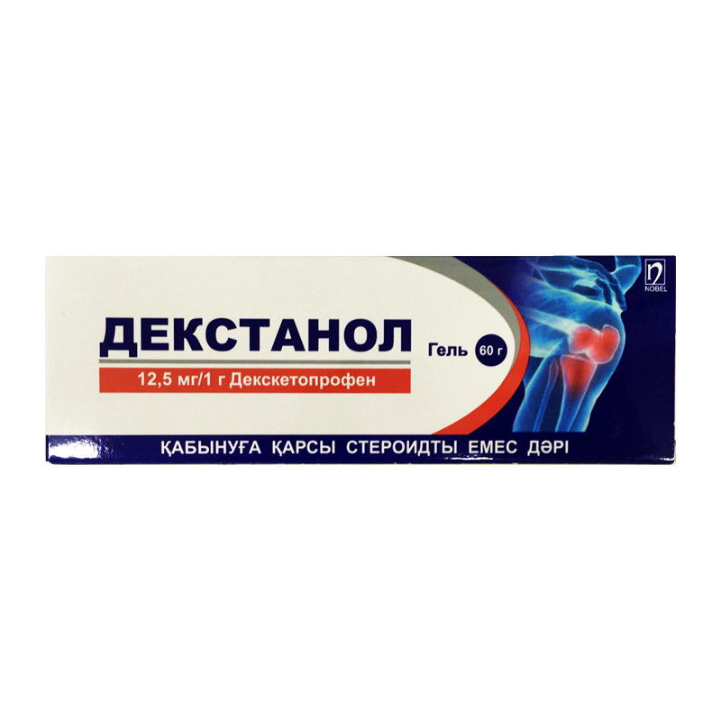 Прозрачный гель с запахом лаванды | Состав+1 грамм препарата содержитдекскетопрофена трометамол 18.50 мг (эквивалентно декскетопрофену 12.5 мг) | Противопоказания+- Гиперчувствительность к декскетопрофену или любому компоненту препарата- гиперчувствительность к ацетилсалициловой кислоте или другим НПВС- мокнущие дерматозы- экзема- инфицированные ссадины- открытые раны, глаза, слизистые оболочки (рта, носа, гениталий)- беременность и период лактации- детский возраст до 12 лет | Побочные действия+Редко:- зуд, чувство жжения в месте нанесения препарата, отекОчень редко:- аллергические реакции (гиперемия кожи, фотосенсибилизация, кожнаяэкзантема, пурпура)- фотосенсибилизация (светочувствительность), (на коже образование пупырышек наполненные водой), покраснение- ДЕКСТАНОЛ не рекомендуется пациентам, у которых ацетилсалициловая кислота и другие НВПС могут вызвать астму, ринит или аллергическую сыпь- острый аллергический ринит- полипы в носу- аллергический отек лица и горла аллергического характераВ таких случаях лечение препаратом следует прекратить. | Способ применения+Наружно.Полоску геля длиной 4-5 см наносят легкими втирающими движениями в воспаленные или болезненные участки тела 2-3 раза в сутки. Продолжительность использования без консультации врача не более 7 дней. | Показания к применению+Болевой синдром легкой и средней интенсивности:» заболевания опорно-двигательного аппарата (суставной синдром при ревматизме и обострении подагры, ревматоидный артрит, псориатический артрит, анкилозирующий спондилоартрит, остеоартроз, остеохондроз с корешковым синдромом, радикулит, воспалительное поражение связок, сухожилий, бурсит, ишиас, люмбаго)» мышечные боли ревматического и неревматического происхождения» посттравматическое воспаление мягких тканей и опорно-двигательного аппарата (повреждения и разрывы связок, ушибы) | МНН: ДекскетопрофенОбъем: 12.5 мг/1гАртикул: A02-0023701