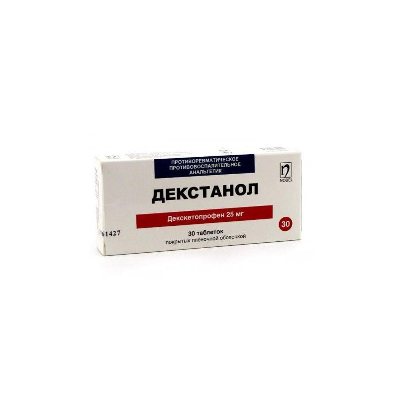 Таблетки круглой формы, с двояковыпуклой поверхностью, покрытые пленочной оболочкой белого цвета, с риской на одной стороне. | Состав+Одна таблетка содержитдекскетопрофена трометамол 36,9 мг эквивалентно 25 мг декскетопрофена соответственно | Противопоказания+- повышенная чувствительность к декскетопрофену или другим нестероидным противовоспалительным препаратам- язвенная болезнь желудка и двенадцатиперстной кишки (в т.ч. желудочно-кишечные кровотечения и склонность к ним)- активные кровотечения различного генеза, повышенная кровоточивость- одновременный прием антикоагулянтов- болезнь Крона, неспецифический язвенный колит- бронхиальная астма (в т.ч. в анамнезе), рецидивирующий полипоз носа и околоносовых пазух, непереносимость ацетилсалициловой кислоты- тяжелая сердечная недостаточность- тяжелая почечная недостаточность (клиренс креатинина менее 30 мл/мин)- активные заболевания печени, тяжелое нарушение функции печени- период после проведения аортокоронарного шунтирования- подтвержденная гиперкалиемия- воспалительные заболевания кишечника- детский и подростковый возраст до 18 лет- беременность и период лактации | Побочные действия+- анемия, в т.ч. апластическая и гемолитическая, пурпура, агранулоцитоз, гипоплазия костного мозга; очень редко — нейтропения, тромбоцитопения- тошнота, рвота; нечасто — диспепсия, изжога, боли в животе, диарея, запор, кровавая рвота, сухость слизистой оболочки полости рта- эрозивно-язвенные поражения желудочно-кишечного тракта, включая кровотечения и перфорации, анрексия, повышение активности печеночых трансаминаз (аланинаминотрансферазы и аспартатаминотрансферазы), желтуха; очень редко — нарушение функции печени- головная боль, головокружение, бессонница, сонливость; редко — парестезии- нечеткость зрительного восприятия, шум в ушах- снижение или повышение АД, ощущение жара, гиперемия кожных покровов, экстрасистолия, тахикардия, периферические отеки, тромбофлебит поверхностных вен- брадипноэ; очень редко — бронхоспазм- полиурия, почечная колика; очень редко — нефрит, нефротический синдром- дисменорея- нарушение функции предстательной железы- спазм мышц, затруднение движений в суставах- дерматит, сыпь, потливость; крапивница, угри; очень редко — синдром Стивенса-Джонсона, синдром Лайелла, ангионевротический отек, аллергический дерматит, фотосенсибилизация- гипер- или гипогликемия, гипертриглицеридемия- кетонурия, протеинурия- аллергические реакции: анафилактический шок, отек лица | Способ применения+В зависимости от вида и интенсивности боли, рекомендуемая разовая доза составляет 1/2 таблетки ДЕКСТАНОЛА (12,5 мг) от 1 до 6 раз в сутки с промежутками между приемами 4-6 часов или по 1 таблетке (25 мг) от 1 до 3 раз в сутки через каждые 8 часов.Максимальная суточная доза составляет 3 таблетки препарата (75 мг).У пациентов с нарушением функции печени от легкой до средней степени тяжести или со слегка сниженной функцией почек, у лиц пожилого возраста прием препарата следует начинать в более низких дозах — не более 2-х таблеток ДЕКСТАНОЛА (50 мг) в сутки.При острых болях таблетки нужно принимать минимум за 30 минут до еды.Препарат ДЕКСТАНОЛ не предназначен для длительного применения: продолжительность приема не должна превышать 3-5 дней. | Показания к применению+Болевой синдром легкой и средней инт