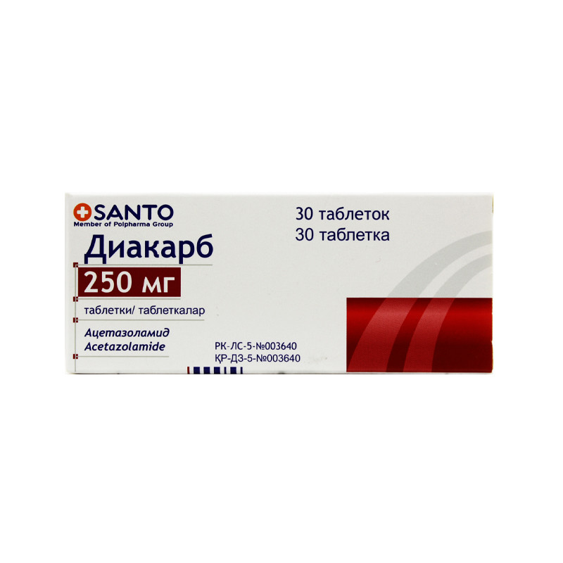 Таблетки белого цвета, круглые, двояковыпуклые. | Состав+Одна таблетка содержитацетазоламид 250 мг | Противопоказания+- при сниженном уровне натрия и калия в сыворотке крови- нарушение функции печени и почек- недостаточность надпочечников- гиперхлорэмический ацидоз- хроническая декомпенсированная закрытоугольная глаукома (в длительной терапии)- повышенная чувствительность к компонентам препарата или к сульфонамидам- болезнью Адиссона- беременность и период лактации | Побочные действия+- парестезии, нарушения слуха или шум в ушах, сонливость и дезориентация, вялый паралич, светобоязнь- потеря аппетита, тошнота, рвота, понос, нарушение вкуса, диареи и полиурии- метаболический ацидоз и нарушения электролитного баланса- временная близорукость- крапивница, анафилаксия- печеночная и почечная колика, почечная недостаточность, нефролитиаз, мочекаменная болезнь- повышенная температура- вялый паралич и повышенная чувствительность к свету- гематурия, глюкозурия, агранулоцитоз, тромбоцитопения, лейкопения и апластическая анемия, недостаточность костного мозга, панцитопения, сыпь в форме полиморфной эритемы- синдром Стивенса-Джонсона, синдром Лайелла. | Способ применения+Препарат принимают внутрь. В случае пропуска приема препарата, при очередном приеме не увеличивать дозу.ГлаукомаДозу препарата следует определять индивидуально в соответствии с величиной внутриглазного давления.Открытоугольная глаукома: 250 мг (1 таблетка) 1 — 4 раза в сутки.Дозы выше 1000 мг (4 таблетки) не повышают терапевтического эффекта.Вторичная глаукома: 250 мг (1 таблетка) каждые 4 часа.У некоторых больных терапевтический эффект проявляется после дозы 250 мг (1 таблетка) 2 раза в сутки (при кратковременной терапии).При острых приступах закрытоугольной глаукомы: начальная доза составляет 500 мг (2 таблетки), затем дозу снижают до 125 мг (1/2 таблетки) или 250 мг (1 таблетка) 4 раза в сутки.ЭпилепсияДозировки для взрослых:250 — 500 мг/сутки в один прием в течение 3 дней, на 4-й день перерыв.При одновременном применении диакарба с другими противосудорожными препаратами в начале лечения применяют 250 мг (1 таблетку) 1 раз в сутки, постепенно увеличивая дозу в случае необходимости.Дозировки у детей:2 — 3 года: 50 — 125 мг/сутки в 1 — 2 приема;4 — 18 лет: 125 — 250 мг однократно утром.У детей не следует применять дозы выше, чем 750 мг в сутки.Отеки при недостаточности кровообращенияНачальная доза препарата составляет 250 — 375 мг (1 — 1 ? таблетки) 1 раз в сутки утром.Максимальный диуретический эффект достигается при приеме препарата через день или два дня подряд с однодневным перерывом.При лечении сердечной недостаточности Диакарб назначают на фоне общепринятой терапии (например, назначение сердечных гликозидов, препаратов калия, диеты со сниженным содержанием натрия).Отеки, обусловленные приемом лекарственных средствРекомендуется 250 — 375 мг (1 — 1 ? таблетки) 1 раз в сутки или два дня подряд с однодневным перерывом.Острая высотная болезньРекомендуется применение препарата в дозе 500 — 1000 мг (2 — 4 таблетки) в сутки в равных дозах.В случае быстрого восхождения — 1000 мг (4 таблетки) в сутки в равных дозах.Препарат следует применять за 24 — 48 часов до восхождения. В случае появления симптомов болезни лечение продолжают в течение следующих 48 часов или дольше, если это необходимо.Внутричерепная гипертензияРеко