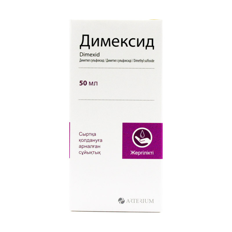 Прозрачная, бесцветная, гигроскопическая жидкость без запаха или со слабым специфическим запахом. | Состав+50 мл жидкости содержитдиметилсульфоксид 50 мл | Противопоказания+- выраженная сердечно-сосудистая недостаточность, атеросклероз, стенокардия- нарушения функции почек и печени- инсульт, коматозные состояния- беременность, период лактации- глаукома, катаракта- детский возраст до 7 лет | Побочные действия+- эритема, зуд, дерматиты- головокружение, бессоница, адинамия- тошнота, рвота, диарея- бронхоспазм | Способ применения+Применяют в виде водных растворов (30 мл Димексида и 70 мл воды или 50 мл Димексида и 50 мл воды) для компрессов, тампонов и промываний. Марлевые салфетки, смоченные раствором Димексида, накладывают на пораженные участки, захватывая прилегающие здоровые участки кожи. Поверх салфетки накладывается полиэтиленовая пленка и хлопчатобумажная либо льняная ткань.При лечении рожистого воспаления и трофических язв препарат применяют в виде водного раствора (30 мл Димексида и 70 мл воды или 50 мл Димексида и 50 мл воды) по 50 — 100 мл 2 — 3 раза в сутки. При экземе, диффузных стрептодермиях рекомендуются компрессы с раствором препарата (40 мл Димексида и 60 мл воды или 90 мл Димексида и 10 мл воды), при фурункулезах — компресс с раствором препарата (40 мл Димексида и 60 мл воды).Для местного обезболивания рекомендуют раствор для компрессов (25 мл Димексида и 75 мл воды или 50 мл Димексида и 50 мл воды) по 100 — 150 мл 2 — 3 раза в сутки. При лечении глубоких ожогов применяют повязки с раствором препарата — 20 мл Димексида и 80 мл воды или 30 мл Димексида и 70 мл воды (при необходимости — в дозе до 500 мл). Растворы препарата (10 мл Димексида и 90 мл воды или 20 мл Димексида и 80 мл воды, или 30 мл Димексида и 70 мл воды) применяют для промывания гнойно-некротических ран, полостей и участков воспаления.В кожно-пластической хирургии применяют повязки с раствором препарата (20 мл Димексида и 80 мл воды или 30 мл Димексида и 70 мл воды) на ауто- и гомотрансплантанты непосредственно после операции и в последующие дни до стойкого приживления трансплантанта. Как консервирующую среду для хранения кожных гомотрансплантантов применяют раствор Димексида в растворе Рингера (5 мл Димексида и 95 мл раствора Рингера). | Показания к применению+- ревматоидный артрит, болезнь Бехтерева, деформирующий остеоартроз, артропатии, растяжение связок- ушибы, травматические инфильтраты, воспалительные отеки- гнойные раны, абсцессы, острые и хронические остеомиелиты- узловая эритема, стрептодермияВ составе комплексной терапии:- деформирующий остеоартроз и ревматический артрит — в сочетании с нестероидными противовоспалительными средствами- склеродермия, акне, рожистое воспаление, фурункулез, фолликулиты и другие кожные заболевания — в комбинации с антимикробными средствами местного типа действия- тромбофлебиты — в сочетании с гепарином- в кожно-пластической хирургии, для консервации кожных гомотрансплантатов. | МНН: ДиметилсульфоксидОбъем: 50 млАртикул: A02-0003393