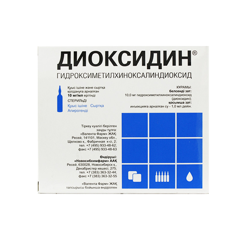Прозрачная зеленовато-желтая жидкость | Состав+1 л препарата содержитгидроксиметилхиноксалиндиоксид (диоксидин) -10 мг | Противопоказания+- гиперчувствительность к диоксидину- надпочечниковая недостаточность (в т.ч. в анамнезе)- беременность и период грудного вскармливания- детский и подростковый возраст до 18 лет. | Побочные действия+При внутриполостном введении:- головная боль, озноб, повышение температуры тела- тошнота, рвота, боли в животе, диарея- судорожные сокращения мышц- аллергические реакции, редко- анафилактический шок- фотосенсибилизирующий эффект (появление пигментированных пятен на теле при воздействии солнечных лучей).При наружном применении:- околораневый дерматит, зуд. | Способ применения+Диоксидин назначают в условиях стационара. Применяют наружно, внутриполостно.1% раствор диоксидина нельзя использовать для внутривенного введения, ввиду нестабильности раствора при хранении при низких температурах.Внутриполостное введение. В гнойную полость в зависимости от ее размеров вводят в сутки от 10 до 50 мл 1% раствора Диоксидина. Раствор Диоксидина вводят в полость через катетер, дренажную трубку или шприцем.Максимальная суточная доза для введения в полости 70 мл 1% раствора.Препарат вводят в полость обычно один раз в сутки. По показаниям возможно введение суточной дозы в два приема. При хорошей переносимости препарат можно вводить ежедневно в течение 3-х недель и более. При необходимости через 1-1,5 месяца проводят повторные курсы.Наружное применение. Применяют 0,1-1% растворы Диоксидина. Для получения 0,1-0,2% растворов ампульные растворы препарата разводят до нужной концентрации стерильным 0,9% раствором натрия хлорида или водой для инъекций. Для лечения поверхностных инфицированных гнойных ран на рану накладывают салфетки, смоченные 0,5-1% раствором Диоксидина. Глубокие раны после обработки, рыхло тампонируют тампонами, смоченными 1% раствором Диоксидина, а при наличии дренажной трубки в полость вводят от 20 до 100 мл 0,5% раствора препарата.Для лечения глубоких гнойных ран при остеомиелите (раны кисти, стопы) применяют 0,5-1% растворы препарата в виде ванночек или проводят специальную обработку раны раствором препарата в течение 15-20 мин (введение в рану раствора на этот срок) с последующим наложением повязок 1% раствором Диоксидина.Диоксидин в виде 0,1-0,5% растворов можно использовать для профилактики и лечения инфекции после оперативных вмешательств. По показаниям (больные остеомиелитом) и при хорошей переносимости лечение можно проводить ежедневно в течение 1,5-2 месяцев.При применение у пожилых лиц следует учитывать возрастное понижение функции почек, которое может потребовать уменьшения дозы препарата. | Показания к применению+Гнойные бактериальные инфекции, вызванные чувствительной микрофлорой при неэффективности других химиотерапевтических средств или их плохой переносимости.Внутриполостное введение- гнойные процессы в грудной и брюшной полости, при гнойных плевритах, эмпиемах плевры, абсцессах легких, перитонитах, циститах, ранах с наличием глубоких гнойных полостей (абсцессы мягких тканей, флегмоны тазовой клетчатки, послеоперационные раны мочевых и желчевыводящих путей, гнойный мастит и др.)- профилактика инфекционных осложнений после катетеризации мочевого пузыря.Наружное применение- поверхностные и глу