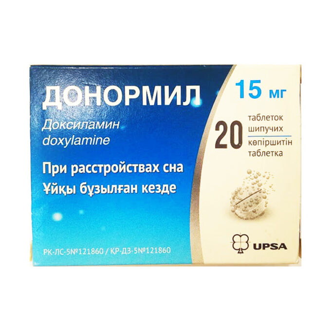 Таблетки белого цвета, цилиндрические, плоские, со скошенными краями и риской для деления на одной стороне, растворимые в воде с шипучей реакцией, сколы допустимы. | Состав+Одна таблетка содержитдоксиламина сукцинат 15 мг | Противопоказания+- повышенная чувствительность к антигистаминным препаратам- закрытоугольная глаукома в семейном анамнезе или анамнезе пациента- уретропростатические нарушения с риском задержки мочи- период грудного вскармливания- детский возраст до 15 лет | Побочные действия+Редко- сухость во рту, нарушения аккомодации, запор, сильное сердцебиение- сонливость в дневное время, при развитии которой необходимо снизить дозу- задержка мочи | Способ применения+Рекомендуемая доза составляет 7,5-15 мг в сутки, то есть 1/2-1 таблетки в сутки. Таблетку принимают внутрь за 15-30 минут до сна, растворив в стакане воды.При необходимости, доза может быть увеличена до 30 мг в сутки, то есть 2 таблетки в день.Взрослым с почечной или печеночной недостаточностью рекомендовано уменьшить дозу.Продолжительность лечения — 2-5 дней. Если бессонница не проходит через5 дней‚ лечение должно быть пересмотрено. | Показания к применению+- периодическая и транзиторная бессонница. | МНН: ДоксиламинОбъем: 15 мгАртикул: A01-0004655