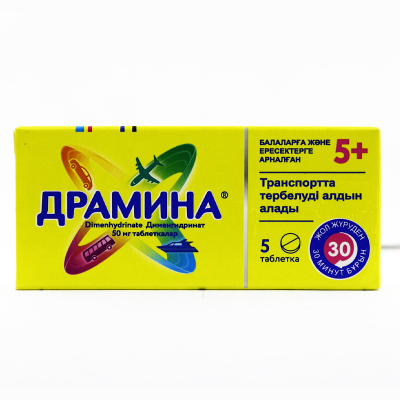 Таблетки белого цвета, круглые с плоской и гладкой поверхностью, с фаской и риской на одной стороне, высотой (3,0 ± 0,2) мм, диаметром (9,0 ± 0,1) мм, без запаха, без горького вкуса. | Состав+Одна таблетка содержитдименгидринат — 50 мг | Противопоказания+- повышенная чувствительность к компонентам препарата- эпилепсия- острые экссудативные и везикулярные дерматозы- детский возраст до 1 года- беременность, период лактации | Побочные действия+- головокружение, сонливость, головная боль, общая слабость, усталость, нарушение концентрации внимания, беспокойство, нервозность, бессонница, редко — ослабление ночного и цветного зрения, затуманенность зрения, нарушение аккомодации- сухость во рту, снижение аппетита, тошнота, рвота, диарея- сухость слизистой оболочки носа и горла, сгущение бронхиального секрета- снижение артериального давления, тахикардия, аритмия- гемолитическая анемия-кожная сыпь, ангионевротический отек, бронхоспазм, редко — медикаментозный дерматит- затруднение мочеиспусканияОбо всех случаях побочных явлений следует уведомить врача. | Способ применения+Внутрь, перед едой.-детям от 1 года до 6 лет 1/4 — 1 /2 таблетки 2-3 в сутки- детям от 7 лет до 12 лет 1 /2- 1 таблетка 2-3 раза в суткиВзрослым 1- 2 таблетки 2 — 3 раза в сутки.Максимальная суточная доза для взрослых не должна превышать 6 таблеток.Для профилактики кинетозов следует принимать 1 — 2 таблетки за 30 мин до поездки.Продолжительность курса лечения определяет лечащий врач. | Показания к применению+- морская и воздушная болезнь- профилактика и лечение симптомов вестибулярных и лабиринтных нарушений (головокружение, тошнота, рвота), за исключением симптомов, вызванных противоопухолевой терапией- болезнь Меньера | МНН: ДименгидринатОбъем: 50 мгАртикул: A02-0001129