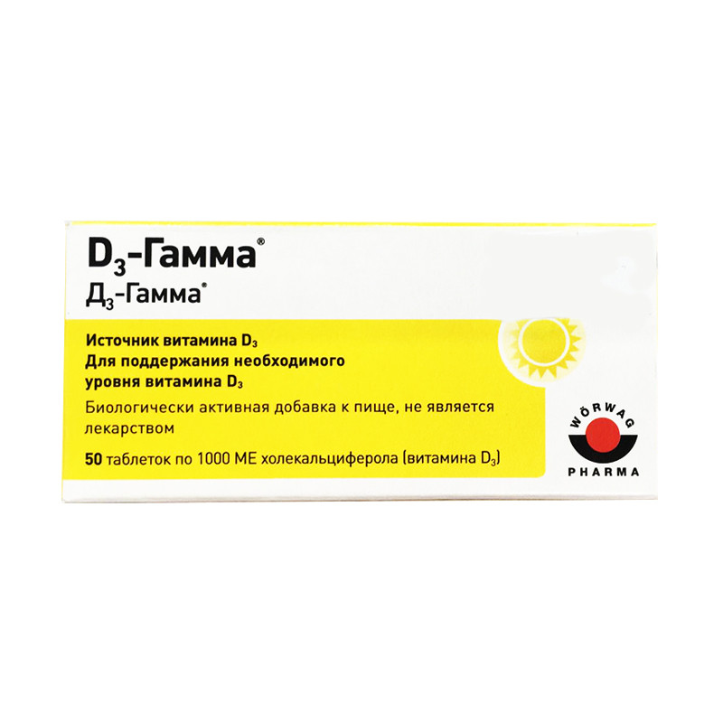 Д3-Гамма таблетки 1000 МЕ 50 таблетокД3-Гамма®содержит 1000 МЕ (25 мкг) витамина D3(холекальциферол), что может помочь восполнить суточную потребность в витамине D.Д3-Гамма®можно принимать для поддержания нормального уровня витамина D3независимо от времени года, инсоляции, пищевых предпочтений, диеты.Витамин D необходим для поддержания:энергетического потенциала организма — способствует уменьшению чувства усталости и улучшению самочувствия;активности иммунной системы, что может способствовать снижению риска развития простудных заболеваний;уровня кальция и фосфора в организме, что способствует обеспечению прочности костей и зубов;нормального деления клеток;здорового функционирования нервной системы, включая психоэмоциональную сферу и когнитивные функции;нормальной репродуктивной функции у женщин и мужчин. | Состав+Целлюлоза микрокристаллическая (Е460), концентрат холекальциферола (желатин, сахароза, крахмал кукурузный, частично гидрогенизированное соевое масло, холекальциферол (витамин D3)), антиокислитель альфа-токоферол (Е307), стабилизаторы (поливинилпирролидон (Е1201), кроскармеллоза натрия (Е466)), антислеживающие агенты (кремния диоксид (Е551), тальк (Е553b), моно- и диглицериды жирных кислот (Е471)). | Противопоказания+Индивидуальная непереносимость компонентов | Способ применения+Принимают внутрь, во время еды, не разжевывая, запивая водой. Взрослым назначают по 1/2 таб./сут. Продолжительность приема — 1 месяц | Показания к применению+Источник витамина D3. Для поддержания необходимого уровня витамина D3 | Объем: Без дозировкиАртикул: A01-0008111