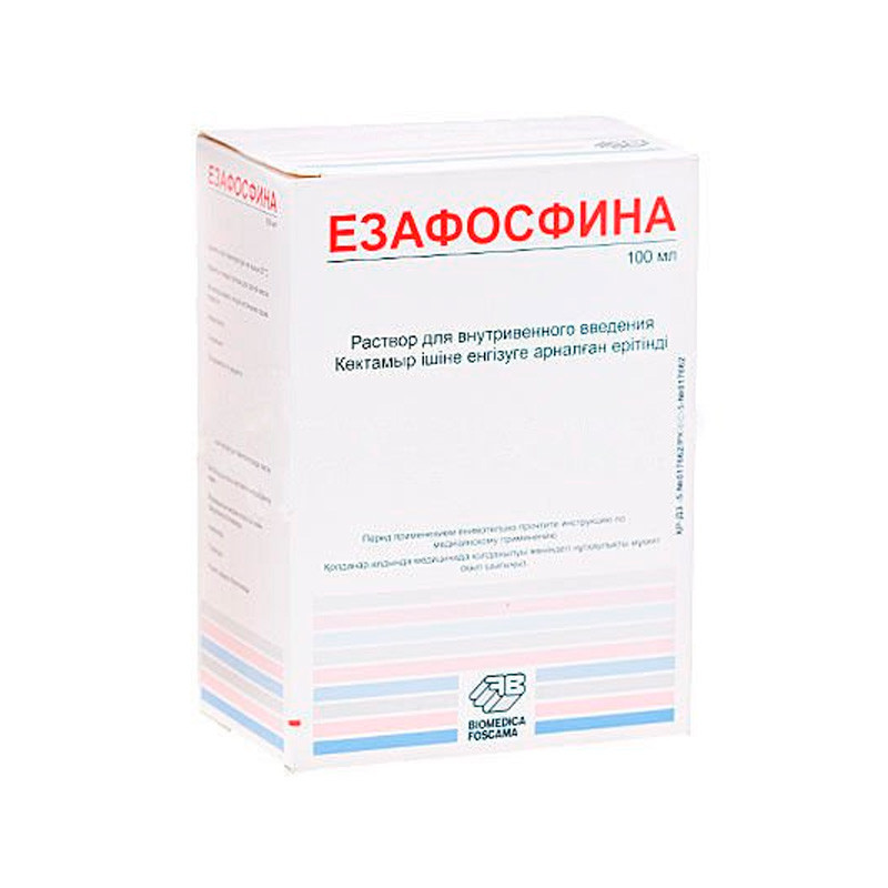 Белый или светло-желтого цвета порошок, с характерным запахом и соленым вкусом.Восстановленный раствор — прозрачная бесцветная или светло-желтого цвета жидкость. | Состав+Один флакон содержитD-фруктозо-1,6-дифосфата натриевой соли 0,5 г, что соответствует 0,375 г кислоты D-фруктозо-1,6-дифосфата | Противопоказания+повышенная чувствительность к препаратунаследственная непереносимость фруктозыгиперфосфатемияпочечная недостаточностьдетский и подростковый возраст до 18 лет (эффективность и безопасность не установлены)беременность и период лактации (ввиду отсутствия данных по безопасности и эффективности) | Побочные действия+Очень редкогиперфосфатемия (при несбалансированных дозах)аллергические реакции разной степени тяжести, вплоть до анафилактического шокаВозможныпокраснение кожных покровов, учащенное сердцебиение, онемение конечностей (в случае введения препарата со скоростью более 10 мл/мин)лихорадочные реакции, инфицирование места инъекции, болезненность в месте введения, раздражение кожи, тромбозы, флебиты, экстравазация | Способ применения+Раствор Езафосфины вводят внутривенно, со скоростью не более 10 мл раствора в 1 мин.Приготовление раствора: лиофилизированный порошок растворяют в 10 мл дистиллированной воды из флакона.Рекомендуемая разовая доза, в зависимости от тяжести заболевания, составляют от 70 мг/кг до 160 мг/кг массы тела (1-2 флакона по 5 г).Доза подбирается в зависимости от степени тяжести гипофосфатемии во избежание накопления излишнего количества фосфора. Для больных, переведенных на полное парентеральное питание, дозировка определяется в зависимости от рекомендуемого количества суточной дозы фосфора. При приеме наименьшей дозировки может применяться ЕЗАФОСФИНА 0,5 г/10 мл.Нельзя превышать рекомендуемые дозы.Раствор (как приготовленный, так и готовый к употреблению) должен быть использован за один прием. Раствор необходимо использовать сразу после приготовления. Возможный остаток не используется. | Показания к применению+Клинически доказанная гипофосфатемия | МНН: ФосфруктозаОбъем: 0.5 г/10 млАртикул: A08-0000845