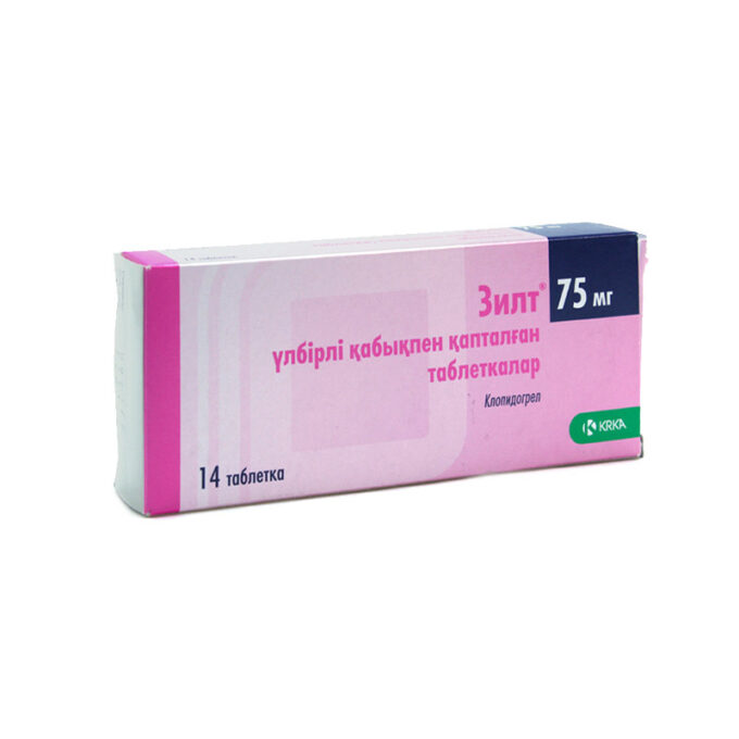 Двояковыпуклые круглые таблетки, покрытые пленочной оболочкой, розового цвета | Состав+клопидогреля гидросульфата 97,875 мг эквивалентно 75 мг клопидогреля | Противопоказания+- гиперчувствительность к клопидогрелю и/или любому из компонентовпрепарата- выраженная печеночная недостаточность- геморрагический синдром, острое кровотечение (в т.ч. внутричерепноекровоизлияние) и заболевания, предрасполагающие к его развитию(язвенная болезнь желудка и 12-перстной кишки в стадии обострения,неспецифический язвенный колит, туберкулез, опухоли легких,гиперфибринолиз)- беременность и период лактации- детский и подростковый возраст до 18 лет (эффективность и безопасностьлекарственного препарата не установлена) | Побочные действия+- боль в груди, гриппоподобные симптомы, боль, утомляемость, астения- головная боль, головокружение, парестезия, судороги ног, гиперестезия,невралгии- синкопе, сердцебиение, периферические отеки, артериальная гипертензия,генерализованные отеки, сердечная недостаточность- тошнота, рвота, боль в животе, диспепсия, диарея, запор, метеоризм,перфорация язвы желудка- сып, зуд- пурпура, эпистаксис, кровотечения желудочно-кишечные, внутрисустав-ные, кровотечения из мочевыводящих путей, кровохарканье,внутричерепные кровоизлияния, забрюшинные кровоизлияния,кровотечения из послеоперационных ран, внутриглазные кровоизлияния,гемоторакс, легочные кровотечения- нейтропения, тромбоцитопения, лейкопения, эозинофилияОчень редко- тромбоцитопеническая тромбогемолитическая пурпура, тяжелаятромбоцитопения, агранулоцитоз, гранулоцитопения, анемия апластическаяили гипохромная, лейкемия- анафилактоидные реакции, сывороточная болезнь- спутанность сознания, галлюцинации, депрессия- вкусовые нарушения- васкулит, гипотензия- кашель, ринит, бронхоспазм, бронхит, интерстициальный пневмонит,пневмония, синуситы- панкреатит, колит (язвенный или лимфоцитарный)- стоматит- острая печеночная недостаточность, гепатит- ангионевротический отек, буллезная сыпь (многоформная эритема, синдромСтивенса-Джонсона, токсический некролиз эпидермиса), эритематознаясыпь, крапивница, экзема и плоский лишай- артралгии, артриты, артрозы, миалгии- цистит, гломерулонефрит- меноррагии- повышение температуры- нарушение функции печени, повышение креатинина крови, гипербилиру-бинемияЕдиничные случаи- гемолитический уремический синдром, мембранозная нефропатия | Способ применения+Рекомендуемая доза препарата Зилт® для взрослых (включая пожилых пациентов) составляет 1 таблетку (75 мг) в сутки независимо от приема пищи.Продолжительность курса лечения определяет лечащий врач.У больных, страдающих синдромом острой коронарной недостаточности:1) синдром острой коронарной недостаточности без повышения сегмента ST (нестабильная стенокардия или инфаркт миокарда без зубца Q), лечение должно быть начато однократной вводной дозой 300 мг, а затем продолжено дозой 75 мг один раз в сутки (с ацетилсалициловой кислотой в дозе 75 — 325 мг в сутки). Так как более высокие дозы ацетилсалициловой кислоты сопряжены с повышенным риском кровотечения, не рекомендуется превышать дозу ацетилсалициловой кислоты 100 мг. Оптимальная продолжительность лечения формально не установлена. Данные клинических испытаний подтверждают применение схемы в течение до 12 месяцев, а максималь