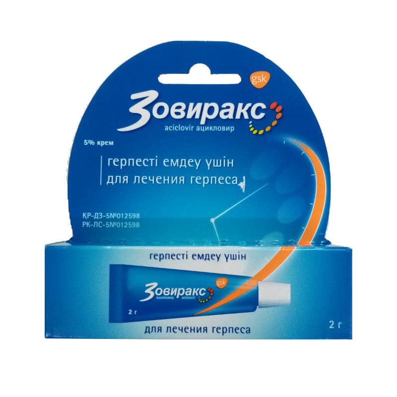 Белый или почти белый мягкий, однородный крем, не содержащий комков и посторонних включений, без признаков расслоения | Состав+ацикловир 5 мг | Противопоказания+- Повышенная чувствительность к ацикловиру и другим компонентам препарата | Побочные действия+- возможны: покраснение, зуд, шелушение, жжение или покалывание на участках нанесения препарата- очень редко: аллергический дерматит, чаще связанный с реакцией на вспомогательные компоненты препарата- единичные случаи: отек Квинке | Способ применения+Препарат рекомендуется наносить 5 раз в день (каждые 4 часа) тонким слоем на пораженные и граничащие с ними участки кожи.Длительность лечения не менее 4 дней. В случае отсутствия заживления лечение может быть продолжено до 10 дней.Крем наносят либо ватным тампоном, либо чистыми руками, чтобы избежать дополнительного инфицирования пораженных участков. | Показания к применению+- Инфекции кожи и слизистых оболочек, вызванных вирусом Herpes simplex типов 1 и 2, в том числе герпес губ. | МНН: АцикловирОбъем: 5%Артикул: A02-0000325