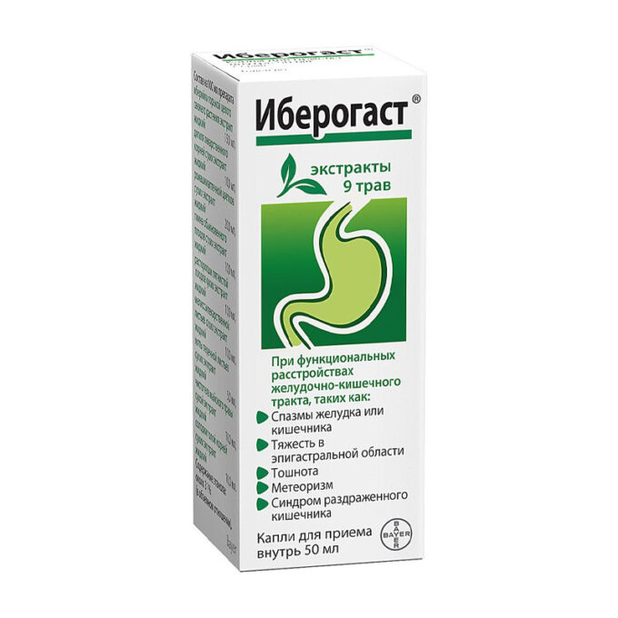 Прозрачная или слегка мутноватая жидкость, темно-коричневого цвета, с характерным запахом и горьковатым вкусом. При хранении возможно выпадение осадка. | Состав+100 мл препарата содержатэкстракт свежих целых растений иберийки горькой 15,0 мл(1: 1.5 — 2.5) *экстракт корней дягиля (1: 2.5 — 3.5)** 10.0 млэкстракт листьев мелиссы (1: 2.5 — 3.5)** 10.0 млэкстракт плодов тмина (1: 2.5 — 3.5)** 10.0 млэкстракт травы чистотела (1: 2.5 — 3.5)** 10.0 млэкстракт корня солодки (1: 2.5 — 3.5)** 10.0 млэкстракт цветков ромашки (1: 2 — 4)** 20.0 млэкстракт листьев мяты перечной (1: 2.5 — 3.5)** 5.0 млэкстракт плодов расторопши (1: 2.5 — 3.5)** 10.0 мл* — экстрагент спирт этиловый 50 %** — экстрагент спирт этиловый 30 %Примечание: Содержание спирта этилового около 31 %. | Противопоказания+- повышенная чувствительность к компонентам препарата- детский возраст до 3 лет | Побочные действия+Очень редко- реакции гиперчувствительности, например кожная сыпь, кожный зуд, одышкаВ случае появления любого из перечисленных побочных действий необходимо прекратить прием препарата и как можно скорее обратиться к врачу | Способ применения+Иберогаст® принимают 3 раза в день до или во время еды с небольшим количеством жидкости:взрослые и подростки по 20 капель,детям от 6 до 12 лет по 15 капель,детям от 3 до 6 лет по 10 капельПродолжительность применения зависит от вида, тяжести и течения болезни.Перед применением взболтать! | Показания к применению+- функциональные нарушения желудочно-кишечного тракта, (например: спастические боли в желудочно-кишечном тракте, чувство переполнения, метеоризм, запоры, диарея или их чередование, тошнота, изжога)- при синдроме раздраженного кишечника- при гастрите, язвенной болезни желудка и двенадцатиперстной кишки(в составе комплексной терапии) | Объем: