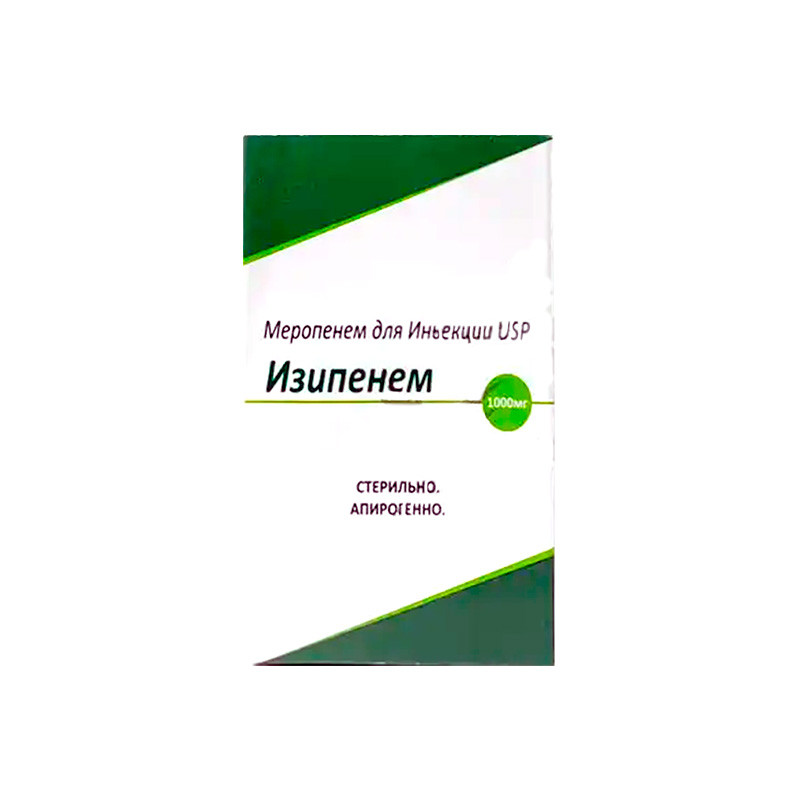 Кристаллический порошок от белого до почти белого цвета. | Состав+Один флакон содержитмеропенема тригидрата эквивалентно меропенему безводному 1000 мг | Противопоказания+- повышенная чувствительность к меропенему в анамнезе;- детский возрат до трёх месяцев (эффективность и безопасность в этой группе пациентов не была исследована).Применять с осторожностью:одновременное введение Изипенема с потенциально нефротоксичными препаратами пациентам с желудочно-кишечными расстройствами, особенно страдающим коликами. | Побочные действия+Часто:- обратимая тромбоцитопения- головная боль- боли в животе, тошнота, рвота, диарея- повышение концентрации щелочной фосфатазы и лактат-дегидрогеназы в сывороткекрови- сыпь, зуд- воспаление и боль в месте введенияНе часто:- эозинофилия, тромбоцитопения- повышение концентрации билирубина в сыворотке кровиРедко:- конвульсииОчень редко:- лейкопения, гранулопения, агранулоцитоз, гемолитическая анемия- ангионевротический отёк, анафилактический шок- парестезии- псевдомембранозный колит- крапивница, мультиформная эритема, синдром Стивенса-Джонсона и токсический эпидермальный некроз- тромбофлебит- вагинальный кандидоз и кандидоз слизистой оболочки полости рта- положительный прямая или непрямая проба Кумбса- снижение ограниченного тромбопластинового времени | Способ применения+Для взрослых пациентов схему приёма лекарственного средства и продолжительность лечения устанавливают в зависимости от типа и тяжести инфекции и состояния пациента. Рекомендуют следующие суточные дозы.При лечении пневмонии, инфекций мочевыводящих путей, гинекологических инфекций (эндометрит и воспалительные заболевания органов малого таза), инфекций кожи и мягких тканей — 500 мг внутривенно каждые 8 часов.При лечении внутрибольничной пневмонии, перитонита, при подозрении на бактериальную инфекцию у больных с нейтропенией, а также при сепсисе — 1 г внутривенно каждые 8 часов.- При лечении менингита — 2 г внутривенно каждые 8 часов.Для пациентов с нарушением функции почек при клиренсе креатинина 51 мл/мин и менее доза должна быть уменьшена следующим образом.Клиренс креатинина Доза на основе единицы Частота ведения(мл/мин) дозирования(500 мг или 1 г или 2 г)50-26 одна единица дозы каждые 12 часов25-10 половина дозы каждые 12 часов‹10 половина дозы каждые 24 часаМеропенем выводится при гемодиализе, в связи с этим, если требуется продолжение лечения, рекомендуется, чтобы единица дозирования (определяется в зависимости от типа и тяжести инфекции) была этилирована после завершения процедуры гемодиализа для восстановления эффективной концентрации в плазме. Применение Изипенема для пациентов, которые подвергаются перитонеальному диализу, ограничено.Для пациентов с печёночной недостаточностью необходимость для изменения дозы отсутствует.Для пожилых пациентов с нормальной функцией почек или КК более 50 мл/мин необходимость для изменения дозы отсутствует.Для детей в возрасте от 3 месяцев до 12 лет рекомендуемая доза для ВВ введения составляет 10-20 мг/кг каждые 8 часов в зависимости от типа и тяжести инфекции, чувствительности патогенного микроорганизма и состояния пациента. Для детей с массой тела тела более 50 кг необходимо использовать те же дозы, что и для взрослых.При менингите рекомендуемая доза составляет 40 мг/кг каждые 8 часо
