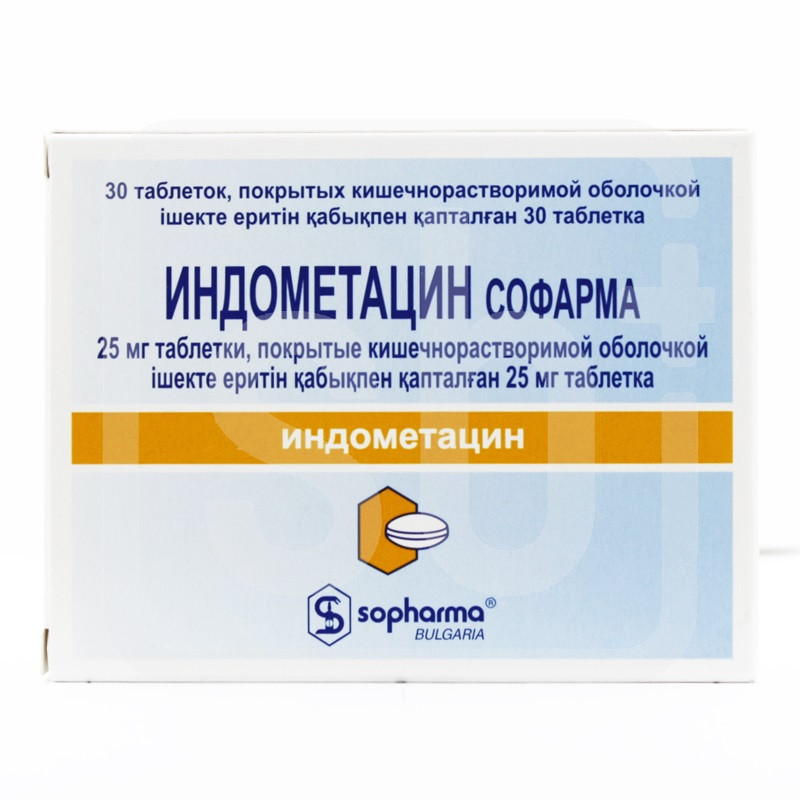 Круглые двояковыпуклые таблетки, покрытые кишечнорастворимой оболочкой, диаметра 7мм; цвет — светло-коричневый, без запаха | Состав+Одна таблетка содержит- индометацин 25мг | Противопоказания+- гиперчувствительность к индометацину или любому из вспомогательных компонентов препарата- гиперчувствительность к аспирину или другим нестероидным противовоспалительным средствам с клиническим проявлением астматического приступа, крапивницы или ринита- язвенная болезнь желудка и двенадцатиперстной кишки, язвенный колит, и/или энтероколит- тромбоцитопения- тяжелая печеночная и почечная недостаточность- беременность и грудное вскармливание- детский возраст до 14 лет. | Побочные действия+- потеря аппетита, тошнота, рвота, боль, диарея; редко: изъязвление желудка и кровотечение из желудочно-кишечного тракта (существует угроза бессимптомной перфорации)- головокружение, головная боль, редко: сонливость, слабость, нарушение концентрации внимания, усталость; очень редко: парестезия, чувство дезориентации, бессонница, раздражительность, депрессия, тревожность, расстройства памяти и психотические реакции- диплопия, нарушение четкости зрительного восприятия, нарушения слуха, шум в ушах, нарушение вкуса- редко: стенокардия, аритмии, усугубление хронической сердечной недостаточности, гипертензия- зуд с или без высыпаний; редко: крапивница; очень редко: буллезные высыпания, покраснение, экзема, эксфолиативный дерматит, аллергическая пурпура- редко: отеки; очень редко: острая почечная недостаточность, нефротический синдром, протеинурия, гематурия, интерстициальный нефрит, папиллярный некроз- лейкопения, тромбоцитопения, агранулоцитоз, гемолитическая анемия, апластическая анемия- повышение сывороточных аминотрансфераз (ALAT, ASAT), преходящее повышение уровня билирубина в сыворотке крови- редко: токсический гепатит с или без желтухи- очень редко: фульминантный гепатит- редко: бронхоспазм, астматические приступы, анафилактические или анафилактоидные реакции у пациентов, страдающих аллергией. | Способ применения+Применяется перорально, после приема пищи, запивая достаточным количеством воды.Взрослые и дети старше 14 летНачальная доза составляет 25мг 2-3 раза в день.При недостаточном терапевтическом эффекте дозу увеличивают до 50 мг 3 раза в день. Максимальная суточная доза составляет 150 мг. При продолжительном лечении суточная доза не должна превышать 75 мг.ПодаграДля купирования острого подагрического приступа назначают начальную дозу, составляющую 100 мг, после чего продолжают лечение 50 мг 3 раза в день до купирования боли. | Показания к применению+- ревматоидный артрит; ювенильный артрит; анкилозирующий спондилоартрит (болезнь Бехтерева); подагра; псориатический артрит; болезнь Рейтера- тендиниты, бурситы, тендобурситы, тендовагиниты, травмы у спортсменов- дископатии, плекситы, радикулоневриты- дисменорея. | МНН: ИндометацинОбъем: 25 мгАртикул: A02-0001130