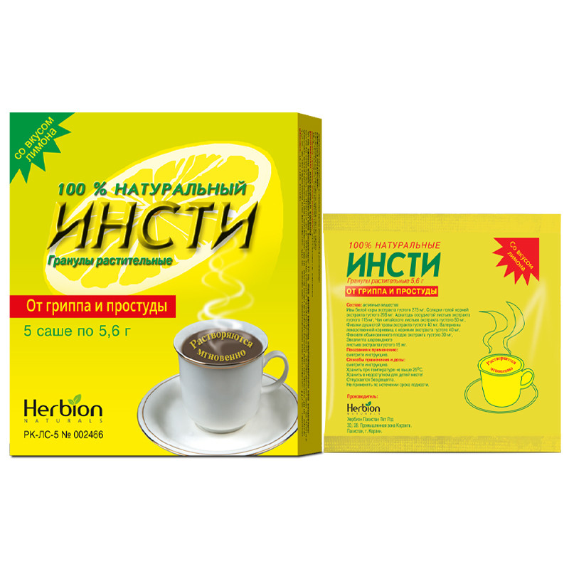 Гранулы коричневого цвета с запахом ментола при раздавливании (для Инсти). Гранулы коричневого цвета с запахом аниса при раздавливании (для Инсти со вкусом аниса). Гранулы коричневого цвета с запахом кардамона при раздавливании (для Инсти со вкусом кардамона). Гранулы коричневого цвета с запахом шоколада при раздавливании (для Инсти со вкусом шоколада). Гранулы коричневого цвета с запахом кофе при раздавливании (для Инсти со вкусом кофе). Гранулы коричневого цвета с запахом лимона при раздавливании (для Инсти со вкусом лимона). | Состав+1 пакетик содержитИвы белой коры экстракта густого 275.00,Адхатоды сосудистой листьев экстракта густого 115.00Фиалки душистой травы экстракта густого 40.00Солодки голой корней экстракта густого 205,00Чая китайского листьев экстракта густого 50, 00Фенхеля обыкновенного плодов экстракта густого 30.00Эвкалипта шаровидного листьев экстракта густого 15.00 Валерианы лекарственной корневищ с корнями 40,00экстракта густого | Противопоказания+- повышенная индивидуальная чувствительность к компонентам препарата- аспириновая астма- сахарный диабет- беременность и период лактации- детский возраст до 3-х лет | Побочные действия+Возможна аллергическая реакция на компоненты препарата, снижение показателей свертываемости крови. | Способ применения+Растворить саше-пакет в чашке горячей воды и пить медленно.Взрослые — по одному саше-пакету 2-3 раза в день.Дети от 3 до 15 лет — по одному саше-пакету 2 раза в день.Курс лечения 5-7 дней. | Показания к применению+- острые воспалительные заболевания верхних и нижних дыхательных путей, сопровождающиеся кашлевым синдромом. | Объем: Пакет (саше) 5.6 гАртикул: A02-0002825