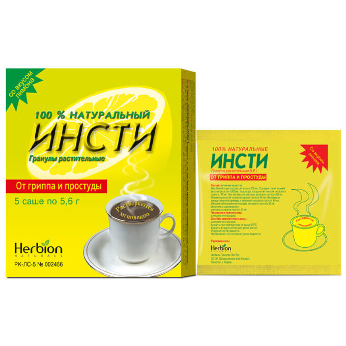 Гранулы коричневого цвета с запахом ментола при раздавливании (для Инсти). Гранулы коричневого цвета с запахом аниса при раздавливании (для Инсти со вкусом аниса). Гранулы коричневого цвета с запахом кардамона при раздавливании (для Инсти со вкусом кардамона). Гранулы коричневого цвета с запахом шоколада при раздавливании (для Инсти со вкусом шоколада). Гранулы коричневого цвета с запахом кофе при раздавливании (для Инсти со вкусом кофе). Гранулы коричневого цвета с запахом лимона при раздавливании (для Инсти со вкусом лимона). | Состав+1 пакетик содержитИвы белой коры экстракта густого 275.00,Адхатоды сосудистой листьев экстракта густого 115.00Фиалки душистой травы экстракта густого 40.00Солодки голой корней экстракта густого 205,00Чая китайского листьев экстракта густого 50, 00Фенхеля обыкновенного плодов экстракта густого 30.00Эвкалипта шаровидного листьев экстракта густого 15.00 Валерианы лекарственной корневищ с корнями 40,00экстракта густого | Противопоказания+- повышенная индивидуальная чувствительность к компонентам препарата- аспириновая астма- сахарный диабет- беременность и период лактации- детский возраст до 3-х лет | Побочные действия+Возможна аллергическая реакция на компоненты препарата, снижение показателей свертываемости крови. | Способ применения+Растворить саше-пакет в чашке горячей воды и пить медленно.Взрослые — по одному саше-пакету 2-3 раза в день.Дети от 3 до 15 лет — по одному саше-пакету 2 раза в день.Курс лечения 5-7 дней. | Показания к применению+- острые воспалительные заболевания верхних и нижних дыхательных путей, сопровождающиеся кашлевым синдромом. | Объем: Пакет (саше) 5.6 гАртикул: A02-0002825