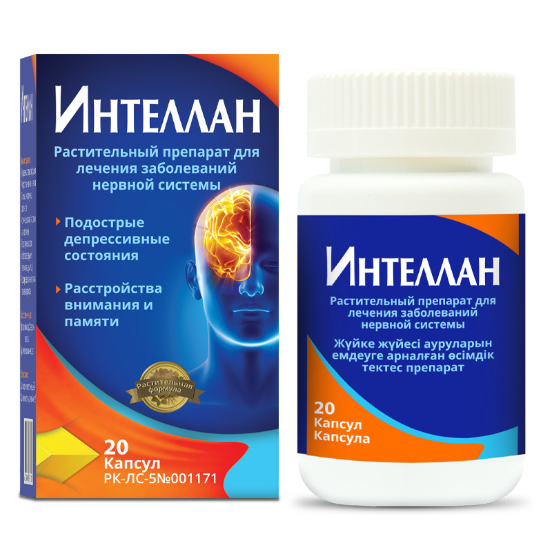 Твердые желатиновые капсулы размером № 0 серого цвета, на корпусе капсул и колпачке напечатано «INTELLAN». Содержимое капсул — порошок коричневого цвета. По внешнему виду должны соответствовать требованиям ГФ РК I, т. 1, общая статья «Капсулы». | Состав+Одна капсула содержитЦентеллы азиатской травы экстракта густого 120.0 мгЭмблики лекарственной плодов экстракта густого 110.0 мгГинко билоба листьев экстракта густого 50.0 мгАмомума шиловидного плодов экстракта густого 50.0 мгКориандра посевного плодов экстракта густого 50.0 мгХерпестис монниера травы экстракта густого 20.0 мг | Противопоказания+- повышенная индивидуальная чувствительность к компонентам препарата | Побочные действия+- аллергические реакции- нарушение сна в случае приема препарата на ночь | Способ применения+Взрослые по 1 капсуле 2 раза в день, после еды. | Показания к применению+- нарушения мозгового кровообращения- расстройства внимания и (или) памяти- снижение интеллектуальных способностей- астенические состояния (психогенные или невротические)- перенапряжение и усталость- нейросенсорные нарушения (головокружение, шум в ушах)- подострые депрессивные состояния и повышенная тревожность. | Объем: КапсулыАртикул: A02-0001892