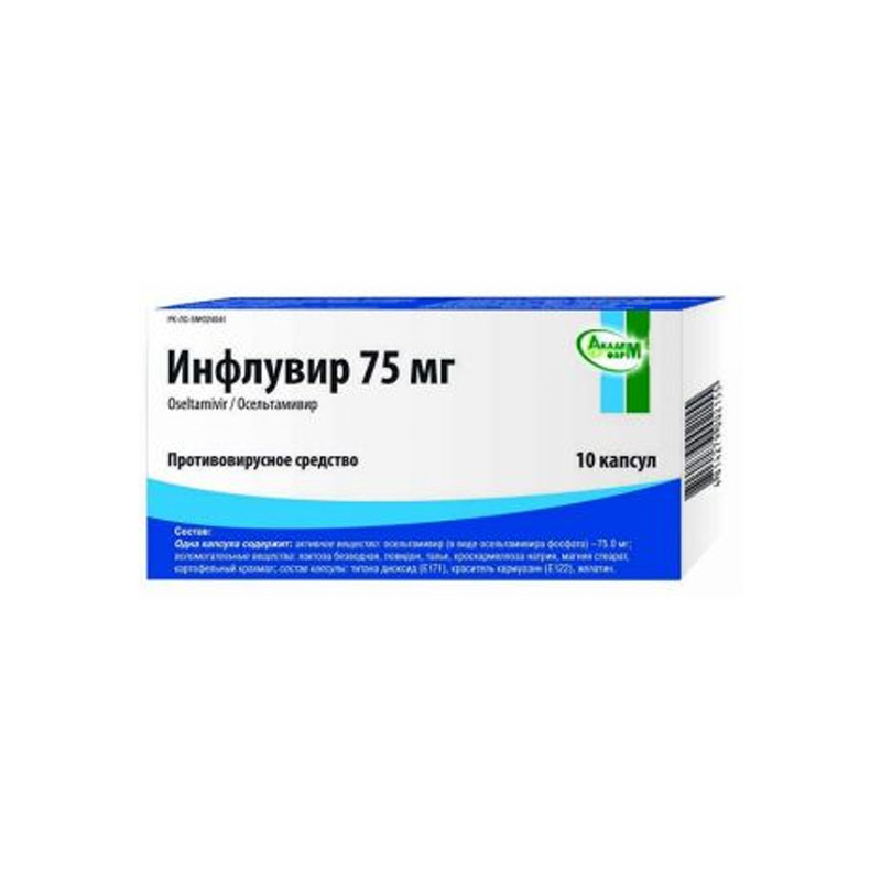 Капсулы твёрдые желатиновые, номер 0, корпус белого цвета, крышечка — красного цвета. Содержимое капсул — смесь порошка и гранул белого с желтоватым оттенком цвета. | Состав+Одна капсула содержитосельтамивир (в виде осельтамивира фосфата) 75.0 мг | Противопоказания+- Повышенная чувствительность к осельтамивиру или к любому другому компоненту препарата;- хроническая почечная недостаточность (постоянный гемодиализ, хронический перитонеальный диализ, клиренс креатинина ?10 мл/мин);- детский и подростковый возраст до 18 лет (оболочка капсулы содержит запрещённый для применения у детей краситель). | Побочные действия+Частота возникновения побочных эффектов: очень часто (больше или равно 1/10), часто (больше или равно 1/100, но ‹1/10), нечасто (больше или равно 1/1000, но ‹1/100), редко (больше или равно 1/10000, но ‹1/1000), очень редко (‹1/10000).В исследованиях лечения и профилактики гриппа у взрослых побочные реакции, наиболее часто встречавшиеся при приёме рекомендованных доз (75 мг два раза в день в течение 5 дней и 75 мг один раз в день до 6 недель), были схожи по частоте возникновения, несмотря на большую продолжительность дозирования в исследованиях профилактики.Побочные эффекты, встречавшиеся в исследованиях осельтамивира для лечения и профилактики гриппа у взрослых или во время постмаркетингового наблюдения:Инфекционные и паразитарные заболевания: часто — бронхит, простой герпес, назофарингит, инфекции верхних дыхательных путей, синусит.Нарушения со крови и лимфатической системы: редко — тромбоцитопения.Нарушения со стороны иммунной системы: нечасто — реакции гиперчувствительности; редко — анафилактические реакции, анафилактоидные реакции.Нарушения психики: редко — возбуждение, необычное поведение, тревожность, спутанность сознания, мания, бред, галлюцинации, кошмары, членовредительство.Нарушения со стороны нервной системы: очень часто — головная боль; часто — бессонница; нечасто — помутнение сознания, судороги.Нарушения со стороны органа зрения: редко — зрительное расстройство.Нарушения со стороны сердца: нечасто — сердечная аритмия.Нарушения со стороны дыхательной системы, органов грудной клетки и средостения: часто — кашель, боль в горле, ринорея.Нарушения со стороны желудочно-кишечного тракта: очень часто — тошнота; часто — рвота, боль в животе (включая боль в верхнем отделе брюшной полости), диспепсия; редко — желудочно-кишечные кровотечения, геморрагический ринит.Нарушения со стороны печени и желчевыводящих путей: нечасто — увеличение активности печёночных энзимов; редко — фульминантный гепатит, нарушения функции печени, гепатит.Нарушения со стороны кожи и подкожных тканей: нечасто — экзема, дерматит, сыпь, крапивница; редко — ангионевротический отёк, мультиформная эритема, синдром Стивена-Джонсона, токсический эпидермальный некролиз.Общие расстройства и нарушения в месте введения: часто — боль, головокружение (включая вестибулярное), усталость, гипертермия, боль в конечностях.Дополнительная информация об отдельных побочных реакцияхВ исследованиях лечения гриппа у взрослых чаще описывались такие побочные действия, как тошнота и рвота, в исследованиях профилактики — тошнота. О большинстве этих побочных действий сообщалось однократно в первый или второй день лечения, и они самопроизвольно проходили в течение 1-2 дней