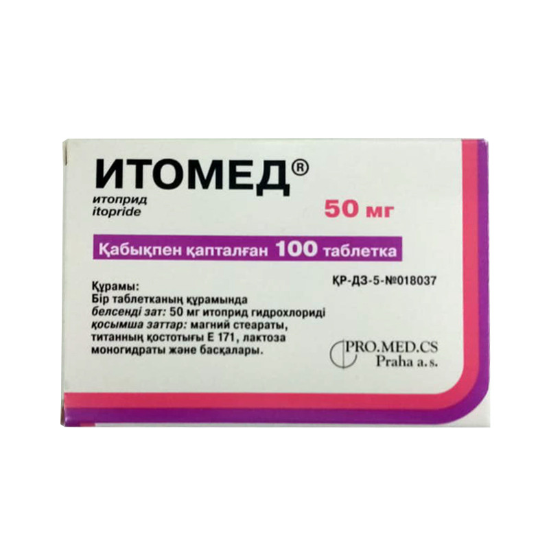 Таблетки круглой формы, с двояковыпуклой поверхностью, покрытые оболочкой белого или почти белого цвета, с насечкой и диаметром около 7 мм. | Состав+Одна таблетка содержититоприда гидрохлорид 50 мг | Противопоказания+- повышенная чувствительность к итоприду или любому вспомогательному компоненту препарата- желудочно-кишечное кровотечение, механическая обструкция или перфорация желудочно-кишечного тракта (ЖКТ)- беременность и период лактации- детский возраст до 16 лет | Побочные действия+Препарат Итомед® обычно хорошо переносится больными.Не часто:- диарея- запор- боль в эпигастрии- повышенное слюноотделение- тошнота- желтуха- повышение активности аспартатаминотрансферазы (АСТ) и аланинаминотрансферазы (АЛТ), гамма-глютамилтрансферазы (ГГТ), щелочной фосфатазы (ЩФ) и уровня билирубина- головная боль, головокружение, тремор- лейкопения, тромбоцитопения- раздражительность- нарушение сна- боли в спине или груди- повышение гормона пролактина, гинекомастияРедко:- аллергические реакции: гиперемия кожи, кожный зуд, сыпь, анафилаксияВышеперечисленные побочные реакции обычно не сильно выражены и исчезают при отмене терапии. | Способ применения+Доза для взрослых — по 50 мг (1 таблетка) 3 раза/сут до еды. Рекомендуемая суточная доза составляет 150 мг. Указанная доза может быть снижена с учетом возраста больного, в зависимости от тяжести заболевания. Доза и длительность лечения зависит от клинического состояния пациента. | Показания к применению+Препарат предназначен для лечения симптомов желудочно-кишечных заболеваний, обусловленных снижением моторики ЖКТ:- вздутие живота- чувство быстрого насыщения- боль или дискомфорт в верхней половине живота, не связанные с язвенной болезнью желудка или другой органической патологией- анорексия- изжога- тошнота- рвота | Объем: