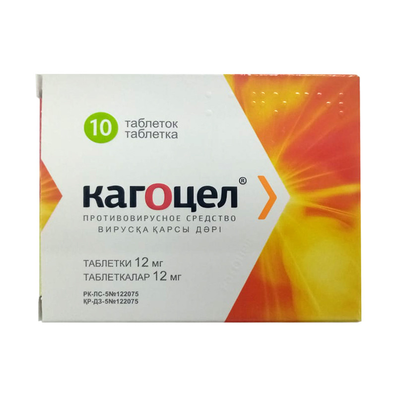 Таблетки от кремового до коричневого цвета круглые двояковыпуклые с вкраплениями. | Состав+1 таблетка содержит:кагоцел® (в пересчете на сухое вещество) 12.00 мг | Противопоказания+- беременность- период лактации- детский возраст до 3 лет- повышенная чувствительность к компонентам препарата- дефицит лактазы, непереносимость лактозы, глюкозо-галактозная мальабсорбция | Побочные действия+Возможно развитие аллергических реакций.Если любые из указанных в инструкции побочных эффектов усугубляются, или Вы заметили любые другие побочные эффекты, не указанные в инструкции, сообщите об этом врачу. | Способ применения+Для приема внутрь.Для лечения гриппа и ОРВИ взрослым назначают в первые два дня — по 2 таблетки 3 раза в день, в последующие два дня — по 1 таблетке 3 раза в день. Всего на курс — 18 таблеток, длительность курса — 4 дня.Профилактика гриппа и ОРВИ у взрослых проводится 7-дневными циклами: два дня — по 2 таблетки 1 раз в день, 5 дней перерыв, затем цикл повторить. Длительность профилактического курса — от одной недели до нескольких месяцев.Для лечения герпеса у взрослых назначают по 2 таблетки 3 раза в день в течение 5 дней. Всего на курс — 30 таблеток, длительность курса — 5 дней.Для лечения гриппа и ОРВИ детям в возрасте от 3 до 6 лет назначают в первые два дня — по 1 таблетке 2 раза в день, в последующие два дня — по 1 таблетке 1 раз в день. Всего на курс — 6 таблеток, длительность курса — 4 дня.Для лечения гриппа и ОРВИ детям в возрасте от 6 лет назначают в первые два дня — по 1 таблетке 3 раза в день, в последующие два дня — по 1 таблетке 2 раза в день. Всего на курс — 10 таблеток, длительность курса — 4 дня.Профилактика гриппа и ОРВИ у детей в возрасте от 3 лет проводится 7-дневными циклами: два дня — по 1 таблетке 1 раз в день, 5 дней перерыв, затем цикл повторить. Длительность профилактического курса — от одной недели до нескольких месяцев. | Показания к применению+Кагоцел® применяют у взрослых и детей в возрасте от 3 лет в качестве профилактического и лечебного средства при гриппе и других острых респираторных вирусных инфекциях (ОРВИ), а также как лечебное средство при герпесе у взрослых. | Объем: 12 мгАртикул: A02-0023529