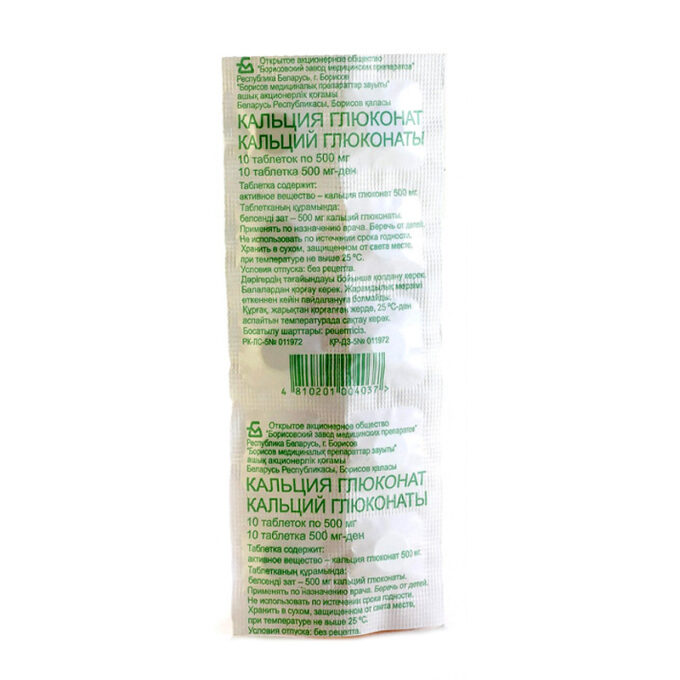 Таблетки белого цвета, плоскоцилиндрические, с риской и фаской. | Состав+Одна таблетка содержит кальция глюконат — 500 мг | Противопоказания+гиперкоагуляционные состояния, склонность к тромбозамтяжелая почечная недостаточностьгиперкальциемиядетский возраст до 6 лет | Побочные действия+тошнота, рвота, диареяредкогиперкалиемия, аритмия, спутанность сознания, чувство тревоги, ощущение онемения или покалывания в кистях рук, ступнях или губах, одышка или затрудненное дыхание, необычное чувство усталости, слабости, ощущение тяжести или слабости в ногах | Способ применения+Применяют внутрь, перед едой.Взрослым назначают по 1,0-3,0 г (2-6 таблеток) 2-3 раза в сутки.При лечении и профилактике остеопороза, ускорении консолидации переломов дозу рассчитывают исходя из содержания элементарного кальция в таблетке (45 мг кальция в 1 таблетке). Обычная суточная доза составляет 1000-1500 мг кальция, что соответствует 2-3 таблеткам кальция глюконата в сутки в 2-3 приема.При лечении гипопаратиреоза и гипокальциемии умеренной степени выраженности применяют в дозе 1000-1500 мг по элементарному кальцию, что соответствует 2-3 таблеткам кальция глюконата в сутки в 2-3 приема совместно с применением витамина D.Детям для лечения и профилактики флюороза назначают в виде месячных курсов. В возрасте 6 лет — 1,0-1,5 г (2-3 таблетки), 7-9 лет — 1,5-2,0 г (3-4 таблетки), 10-14 лет — 2,0-3,0 г (4-6 таблеток) 2-3 раза в день.Курс лечения устанавливается лечащим врачом индивидуально. | Показания к применению+недостаточность функции паращитовидных железгипокальциемияфлюорозостеопороз (лечение и профилактика)ускорение консолидации переломоваллергические заболевания (поллинозы, крапивница), лекарственная аллергиявоспалительные и экссудативные процессы при кожной патологиикапилляротоксикозы, повышенная проницаемость сосудовгиперкалиемическая форма пароксизмальной миоплегии. | МНН: Кальция глюконатАртикул: A02-0000397