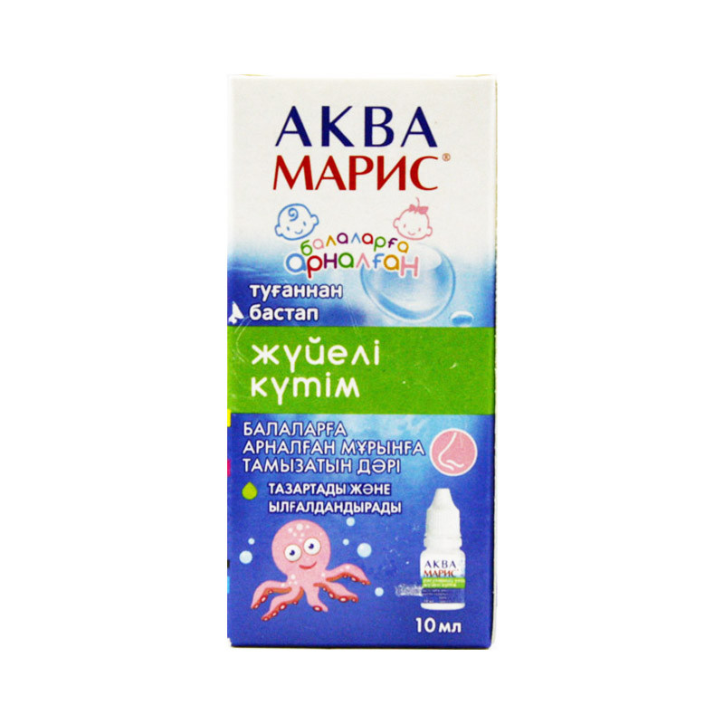 Прозрачный бесцветный раствор без запаха. | Состав+10 мл препарата содержатвода морская — 3,0 мл | Противопоказания+- повышенная чувствительность к компонентам препарата | Побочные действия+- возможны аллергические реакции | Способ применения+В лечебных целях- детям до 1 года: 4 раза в день по 2 капли в каждую ноздрю;Рекомендованный курс лечения во всех случаях составляет 2 — 4 недели (на усмотрение лечащего врача). Рекомендуется повторить курс через месяц.В гигиенических целях- детям до 1 года капли Аква Марис рекомендовано использовать 2 — 3 раза в день по 1 -2 капли в каждую ноздрю;Для размягчения и удаления носовых выделенийАква Марис закапывают в каждый носовой ход по необходимости.Избыток препарата можно осушить с помощью ваты или носового платка. Процедуру можно повторять многократно до тех пор, пока засохшие частицы не размягчатся и удалятся. | Показания к применению+- при острых и хронических воспалительных заболеваниях полости носа, придаточных пазух и носоглотки- при наличии аденоид у детей- после операций в полости носа- при аллергических и вазомоторных ринитах (особенно лицам, предрасположенным или страдающим повышенной чувствительностью к лекарственным препаратам)- для профилактики инфекций полости носа в осенне-зимний период- пациентам, страдающим сухостью слизистой оболочки полости носа- лицам, живущим и работающим в помещениях с отопительными приборами и кондиционированным воздухом с целью сохранения физиологических характеристик слизистой оболочки в измененных микроклиматических условиях- людям, у которых слизистая оболочка верхних дыхательных путей постоянно подвергается вредным воздействиям (курильщики, водители автотранспорта, люди, работающие в запыленных цехах, а также, находящиеся в регионах с суровыми климатическими условиями). | Объем: каплиАртикул: A02-0000018