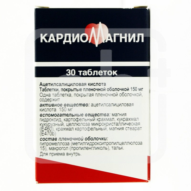 Кардиомагнил таблетки 150 мг 30 шт Такеда ГмбХАцетилсалициловая кислота для профилактики образования тромбов.Применяется приострой и хронической ишемической болезни сердца.Для взрослых и детей старше 15 летОтпускается без рецепта | Состав+Одна таблетка, покрытая пленочной оболочкой, содержит ацетилсалициловая кислота 75 мг или 150 мг | Противопоказания+кровотечение из ЖКТ в анамнезекровоизлияние в мозг в анамнезетромбоцитопения, склонность к кровотечениямгемофилиягеморрагический диатезгипопротромбинемиябронхиальная астмаэрозивно-язвенные поражения ЖКТ в фазе обострениядефицит глюкозо-6- фосфатдегидрогеназыпочечная недостаточностьдетский возраст до 15 летповышенная чувствительность к ацетилсалициловой кислоте или ксалицилатам | Побочные действия+головная боль (часто), бессонница (часто), сонливость (иногда), головокружение (редко), шум в ушахтошнота (часто), изжога (очень часто), рвота (иногда), болевые ощущения в области живота, язвы слизистой оболочки желудка и двенадцатиперстной кишки (иногда), повышение активности «печеночных» ферментов (редко), стоматит (очень редко), эзофагит (очень редко), эрозивные поражения верхних отделов желудочно-кишечного тракта (очень редко), стриктурами (очень редко), колит (очень редко), обострение раздражения кишечника (очень редко).бронхоспазм, кожная сыпь, (у предрасположенных пациентов — провокация приступов бронхиальной астмы)повышенная кровоточивость (очень редко), анемия (редко), гипопротромбинемия (очень редко), тромбоцитопения (очень редко), нейтропения, апластическая анемия (очень редко), эозинофилия (очень редко), агранулоцитоз (очень редко). | Способ применения+Таблетки проглатывают целиком, при необходимости запивая водой.Первичная профилактика сердечно-сосудистых заболеваний, таких как тромбоз и острая сердечная недостаточность при наличии факторов риска в первый день лечения 150 мг/сут, затем — 75 мг/сут.Профилактика повторных инфарктов миокарда и тромбоза кровеносных сосудов по одной таблетки 75мг или 150мг 1 раз в сутки.Профилактика тромбоэмболии после хирургических вмешательств на сосудах сердца по одной таблетки 75мг или 150 мг 1 раз в сутки. | Показания к применению+первичная профилактика сердечно-сосудистых заболеваний, таких как тромбоз и острая сердечная недостаточность при наличии факторов риска (например, сахарный диабет, гиперлипидемия, артериальная гипертензия, ожирение, курение, пожилой возраст)профилактика повторного инфаркта миокарда и тромбоза кровеносных сосудовпрофилактика тромбоэмболии после хирургических вмешательств на сосудах (аортокоронарное шунтирование, чрескожная транслюминальная коронарная ангиопластика)нестабильная стенокардия. | МНН: Ацетилсалициловая кислотаОбъем: 150 мгАртикул: A02-0000919